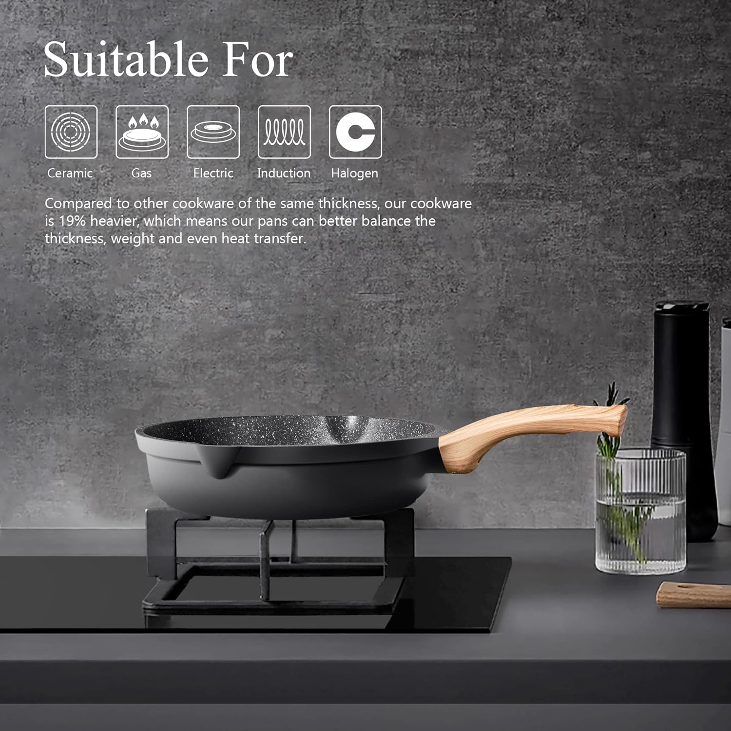 - Safety Healthy Cooking: The nonstick pan is coated with a medical stone that owns certifications from FDA, BSCI & LFGB. The natural mineral nonstick coating is very durable and at the same time 100% free of PFOA, PTFA, lead and cadmium, it is designed for healthy cooking.