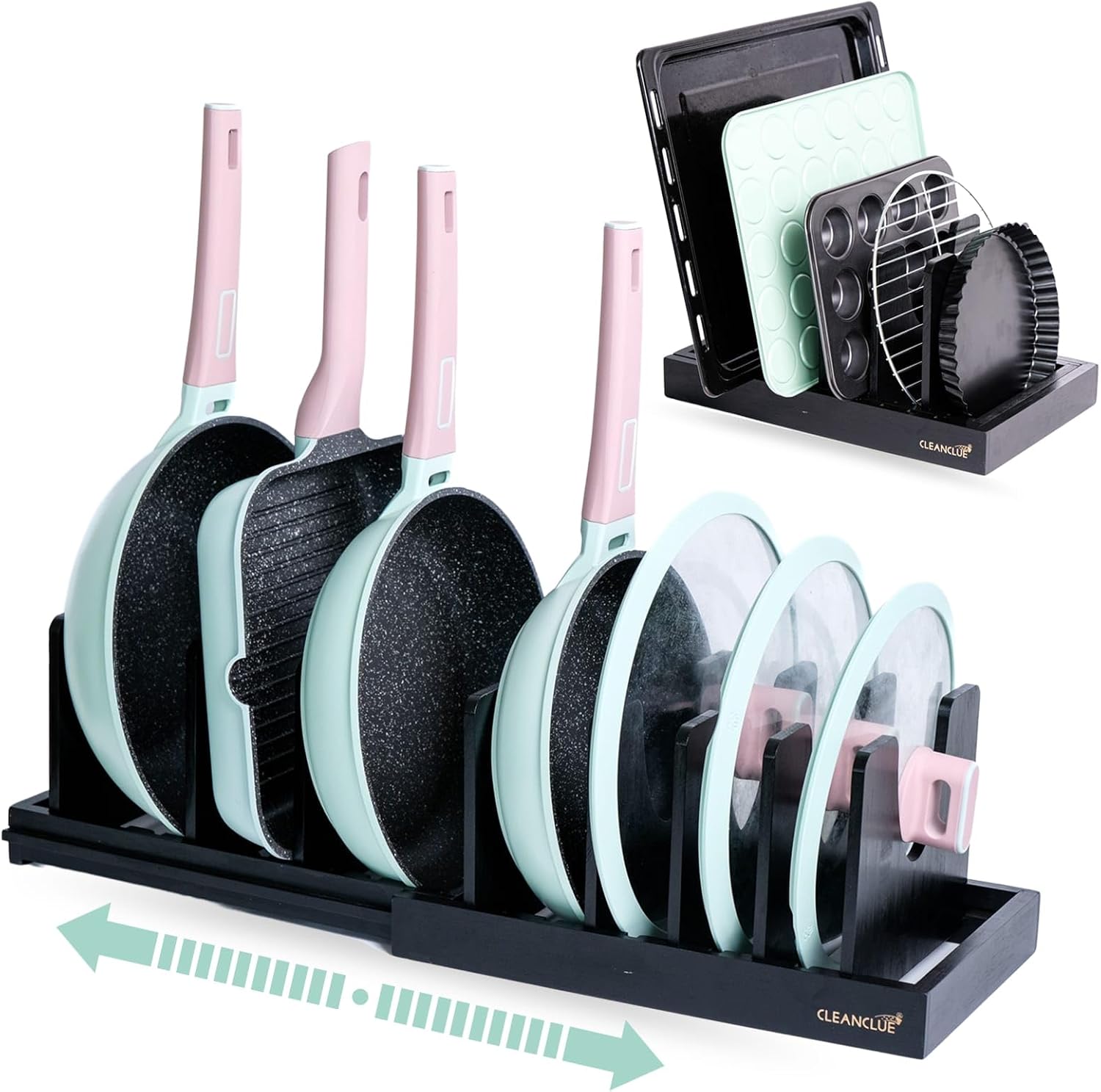Bamboo Expandable Bakeware and Cutting Board Organizer, Adjustable Pot Lids Holder Rack, Cookie Sheet Baking Pan, Tray Organizer for Kitchen Storage (Black)