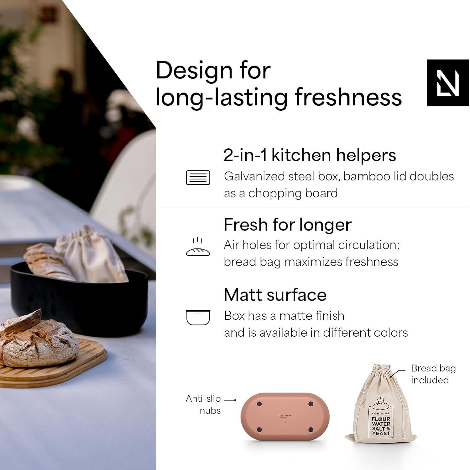 - LONG-LASTING FRESHNESS: The bread box has special ventilation holes on three sides, which provide optimal air circulation. The included linen bread bag keeps pastries & bread extra fresh for longer.