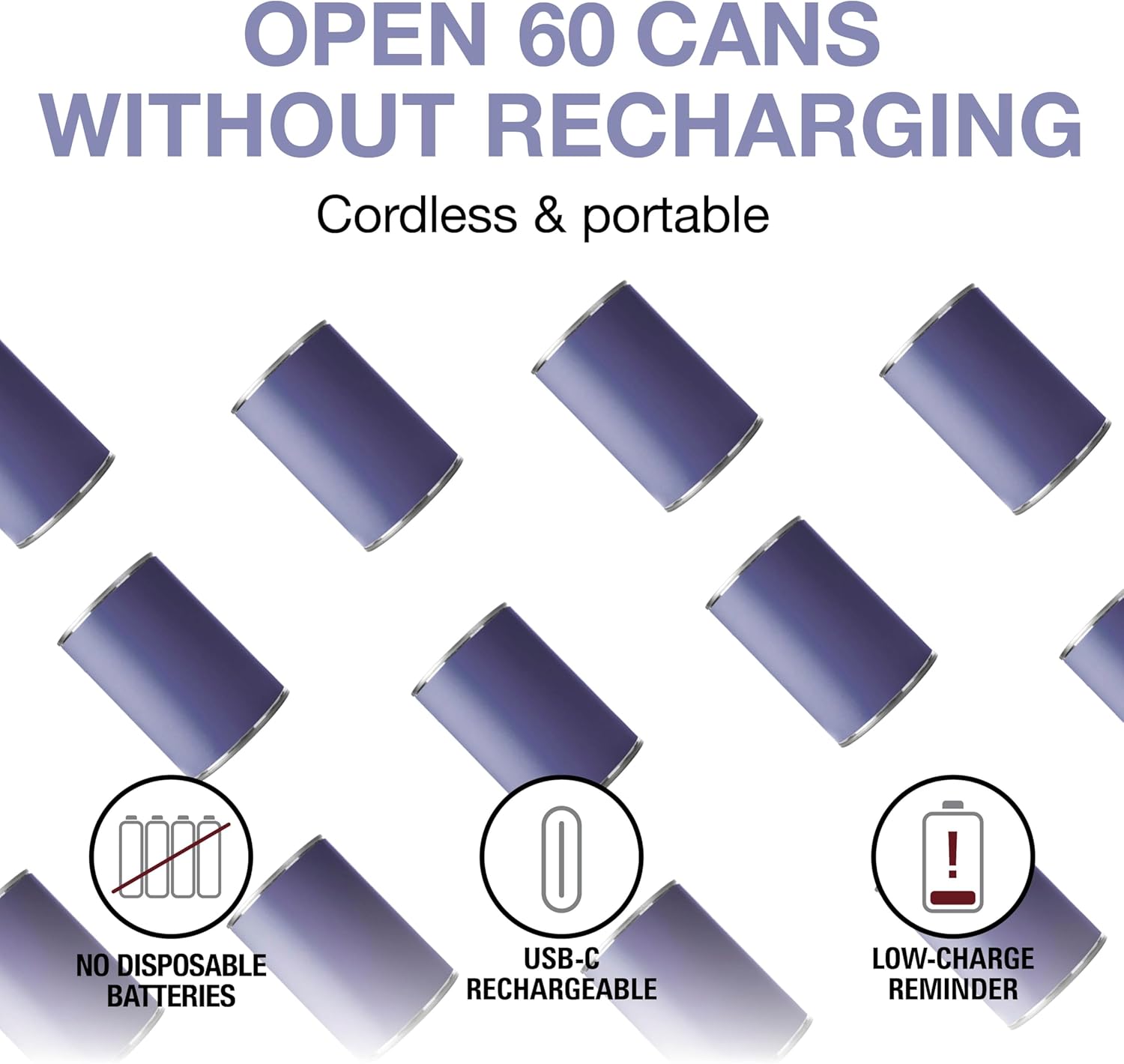 - OPENS 60 CANS ON A SINGLE CHARGE: This portable, rechargeable can opener is great for cookouts, picnics, camping and more. It has a battery indicator light that shows when it needs to be charged, and it fully charges in just 2 hours.