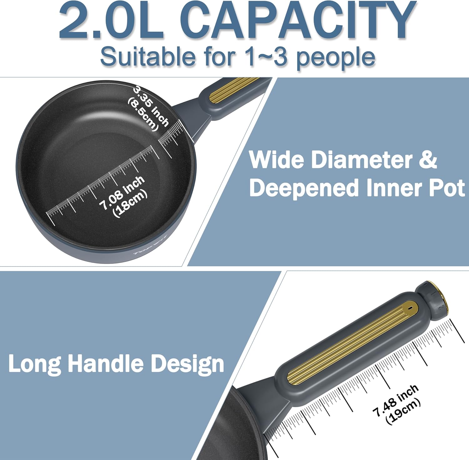 - 【2L Capacity Electric Pot】 This electric cooking pot has a 2-liter capacity, with an inner diameter of 7.08 inches and a depth of 3.35 inches, making it ideal for frying, sautéing, braising, stir-frying, and cooking. With the extended handle design measuring 7.48 inches long, it ensures a more comfortable grip and easy use, also reducing the effort required for handling and making it more labor-saving.