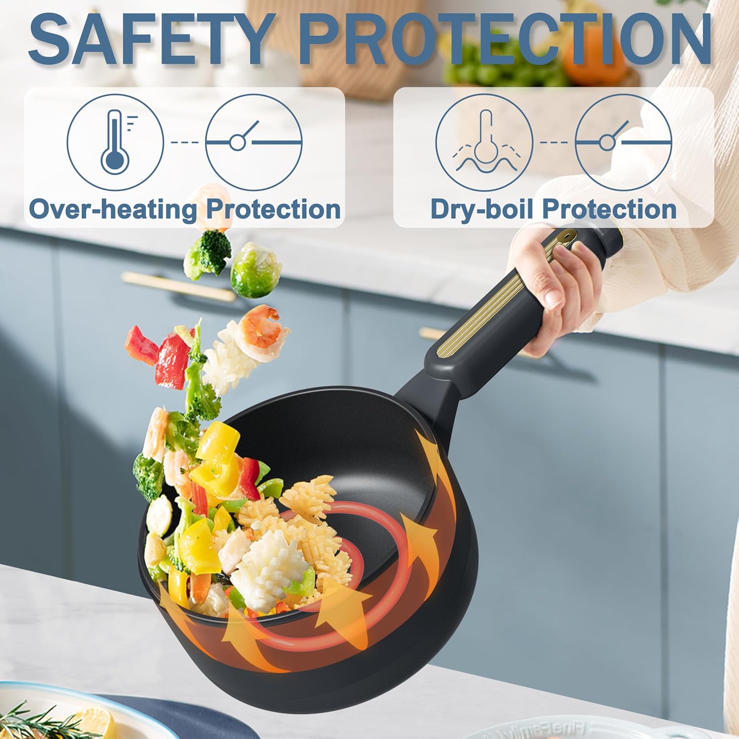 - 【Dual Safety Protection】Equipped with a circular embedded heating element technology, this electric frying pan can heat your food faster and more evenly on its non-stick surface while preventing it from burning. Additionally, the Topwit electric hot pot features overheat protection and dry-boil protection, effectively safeguarding the pot from overheating and continuous boiling in dry and overheated conditions.