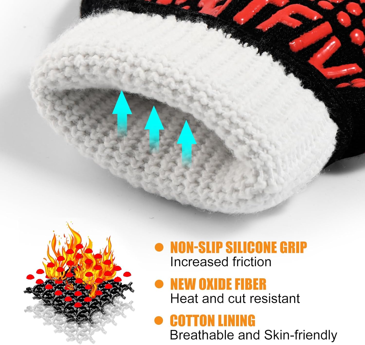 - Heat Resistance:Our oven gloves are made with a high-temperature resistant fiber material on the outer layer, allowing them to withstand temperatures up to 1472°F. This makes them perfect for grilling, baking,smoking, or cooking activities, providing heat insulation protection whether in commercial kitchens or home BBQ setups.