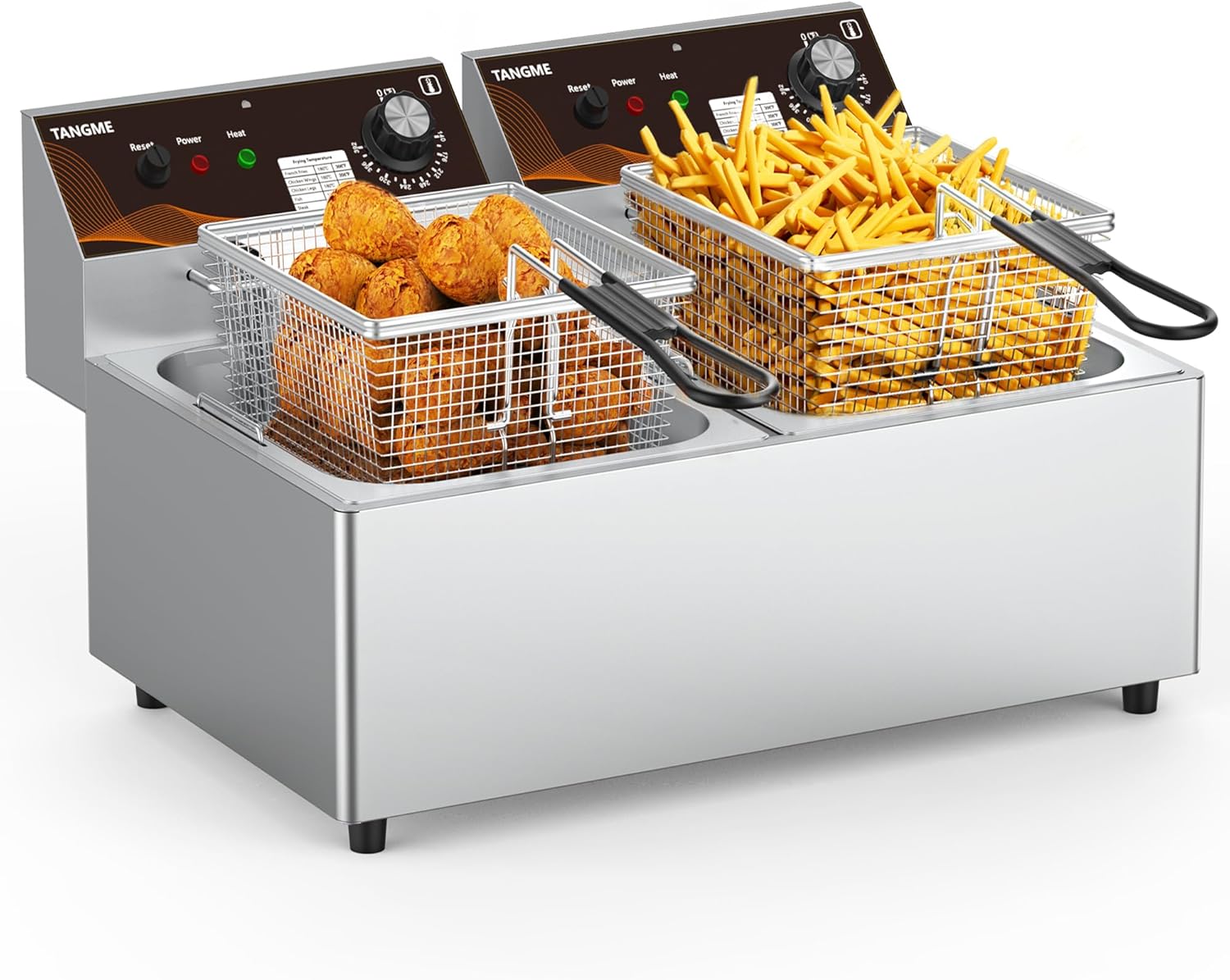 Commercial Deep Fryer with Baskets 20.7Qt Dual Tank Upgraded Electric Countertop Fryer Heavy Duty 1mm Thickened Stainless Steel Deep Fryers, 120V, 3600W, UL Certified