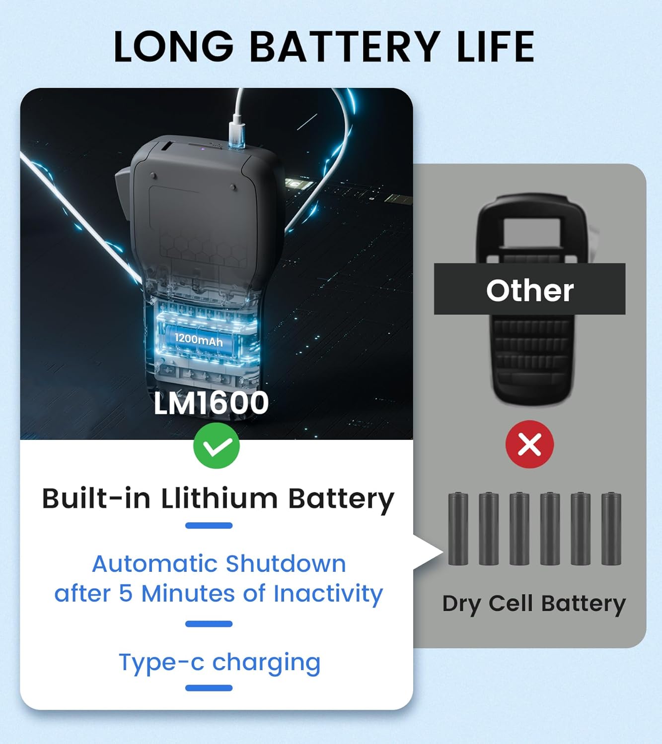 - Durable & Long-lasting Battery Life - Handheld Labeler Machine with Tape comes with a built-in rechargeable 1200mAh lithium battery. In case of low battery, LM1600 Label Maker Machine can be powered using the included USB-C cable, and charging takes only 2 hours. It can continuously print tape for up to 50 meters on a full charge. The rechargeable label maker automatically shuts off after 5 minutes of inactivity to extend battery life