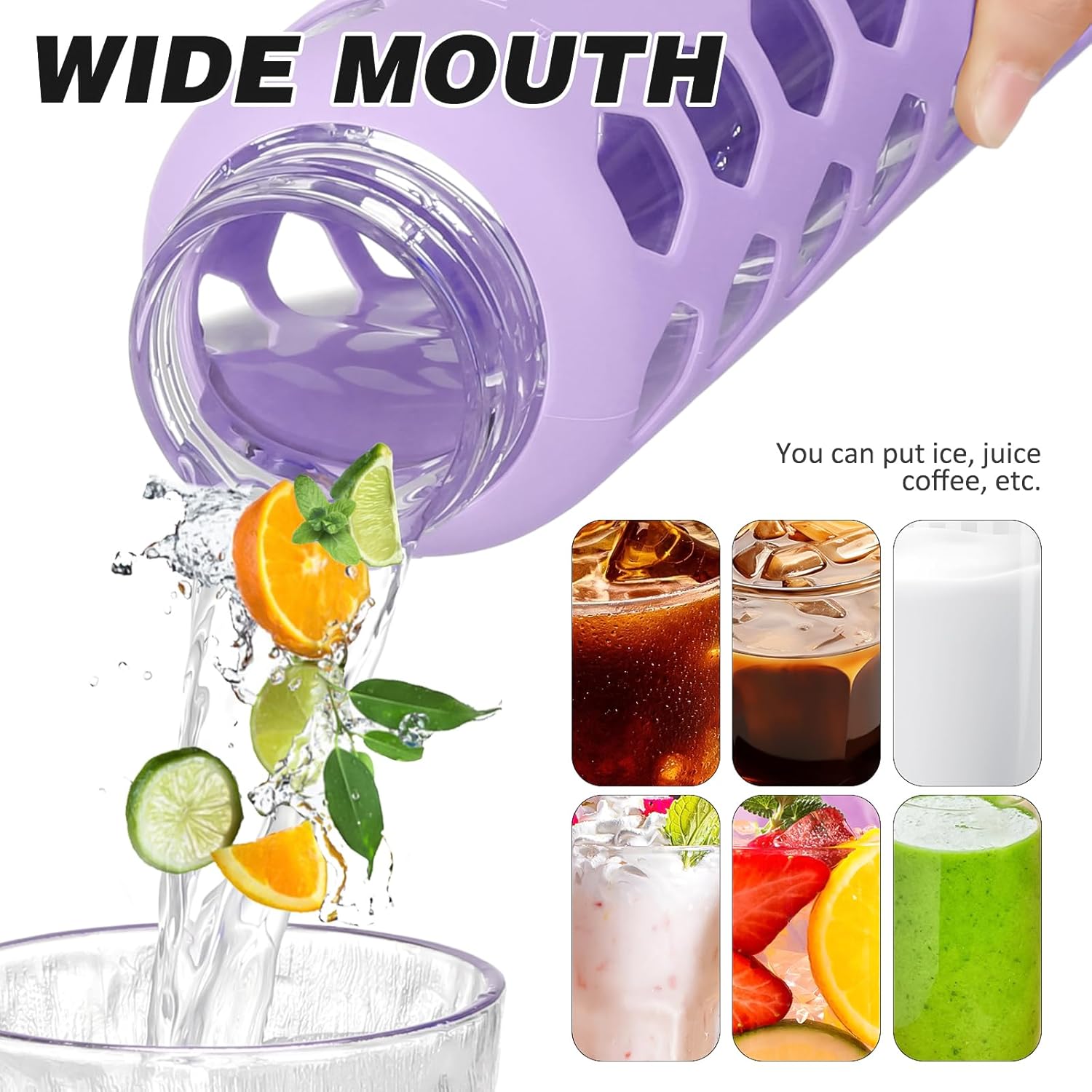 MUKOKO Glass Water Bottles, 24oz Glass Tumbler with Straw, Drinking Bottles with 2 Lids-Handle Spout Lid&Bamboo Straw Lid, Motivational Water Bottle with Time Marker and Silicone Sleeve, 1 Pack-Purple