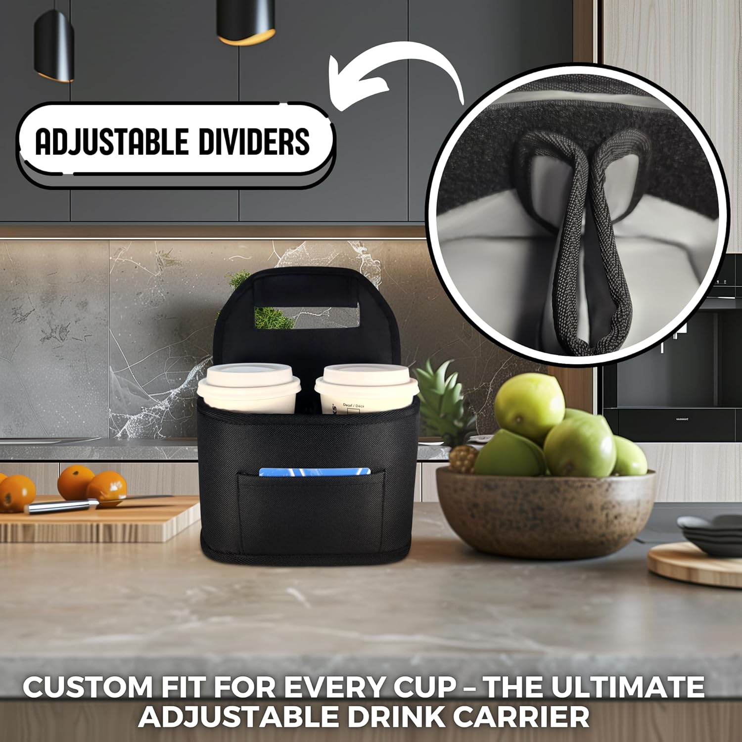 Insulated Reusable 4-Cup Drink Carrier with Adjustable dividers, Money Pocket, Straw Slot and Handle. Ideal for delivery, Takeout, Travel, and Outdoor use