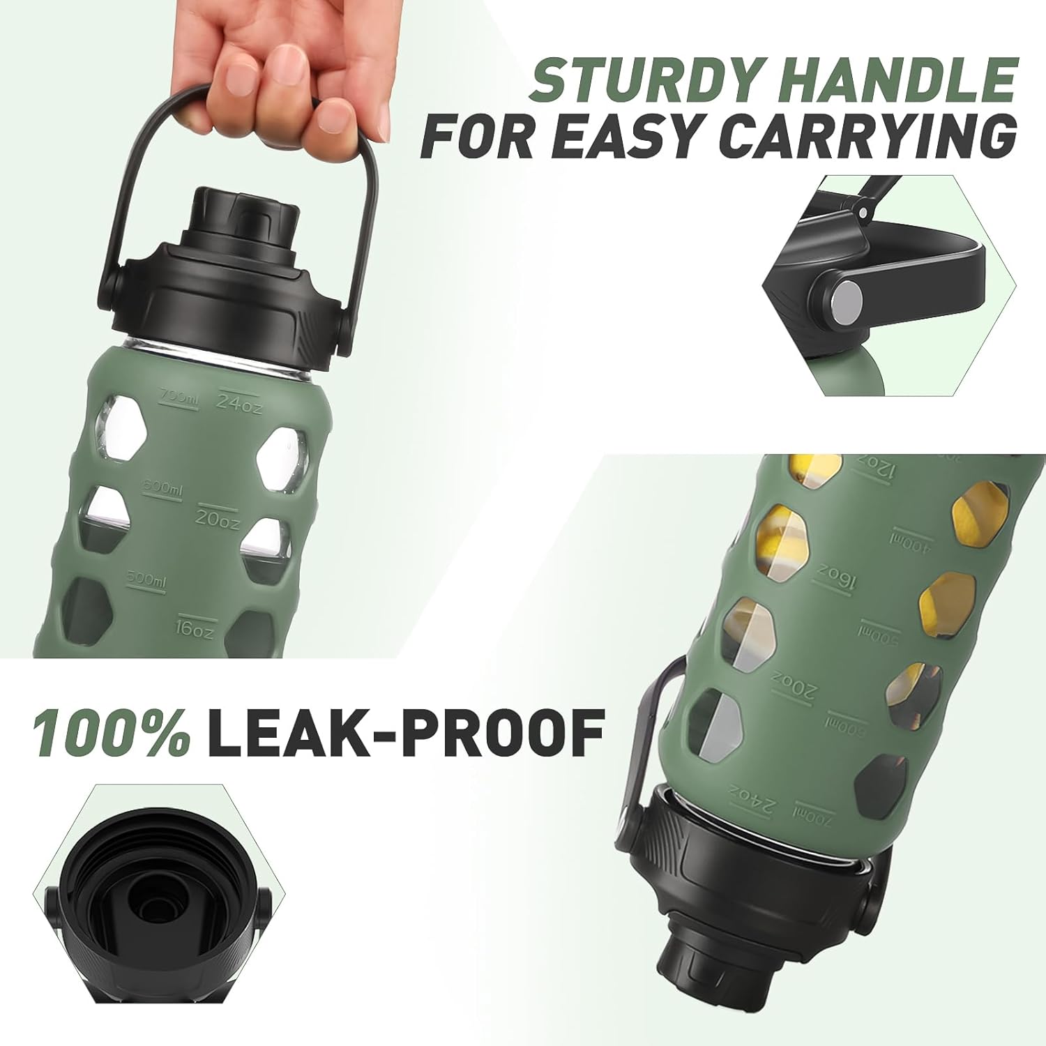 MUKOKO Glass Water Bottles, 24oz Glass Tumbler with Straw, Drinking Bottles with 2 Lids-Handle Spout Lid&Bamboo Straw Lid, Motivational Water Bottle with Time Marker and Silicone Sleeve, 1 Pack-Olive