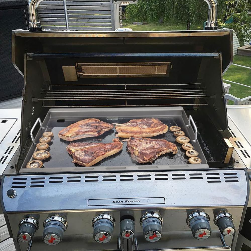 - 【One Parts Two Grill】It only takes a moment to change genesis into a full-sized griddle the grill grid mode to grill griddle mode, cooking different foods in different modes to meet your grilling needs and provide more cooking options.【Dimensions】Griddle Dimension: 23.4 x 19.2 inches, Cooking steaks, pasta, vegetables, potatoes, stir fry as you like and enjoy the barbecue. Make sure you measure the size of your grill and compare with ours before you order.