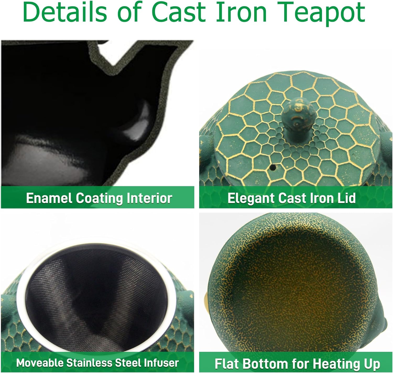 - 【WONDERFUL DESIGN】Cast iron teapot is with Dark Green Hexagon Pattern of the Japanese iron kettle on the surface. It is the necessary decoration to any kitchen.It is a masterful collection for tea lovers. Cast iron teapot could break down the element of Fe2+, which is beneficial to your body. Cast iron teapot also has long heat preservation. So the water after boiled by our cast iron teapot can be more sweeter and softer, which is suitable for all kinds of tea making or other drinks making.