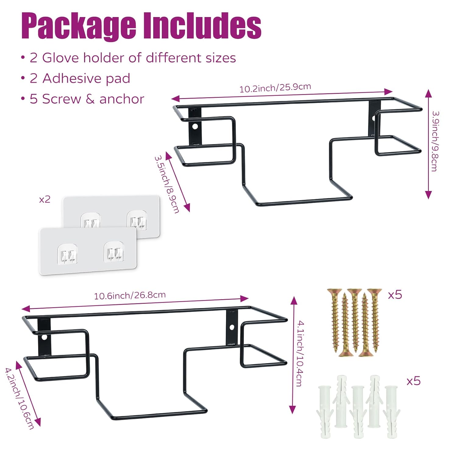 - What Will You Receive:2 glove holders, one large and one small in size. 2 adhesive pads, 5 screws and anchors. The large one can hold boxes measuring 10.28"L*3.78"W or smaller, and the small one can hold 9.8"L*3.1"W or smaller.