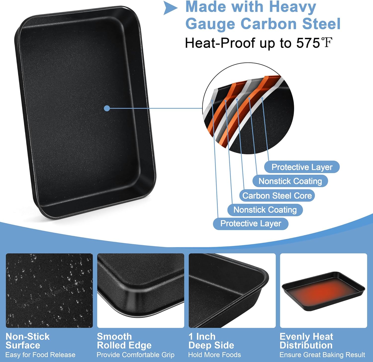 - Carbon Steel Toaster Oven Pan: The excellent heat conductivity of mini carbon steel baking pan transferred heat quickly and evenly, Ensuring great cooking results for the food, Smooth edges no sharp spots, Offers a secure and comfortable hold, 1 inch deep rim to hold more food and avoid food juice spilling out, Keeps your oven clean