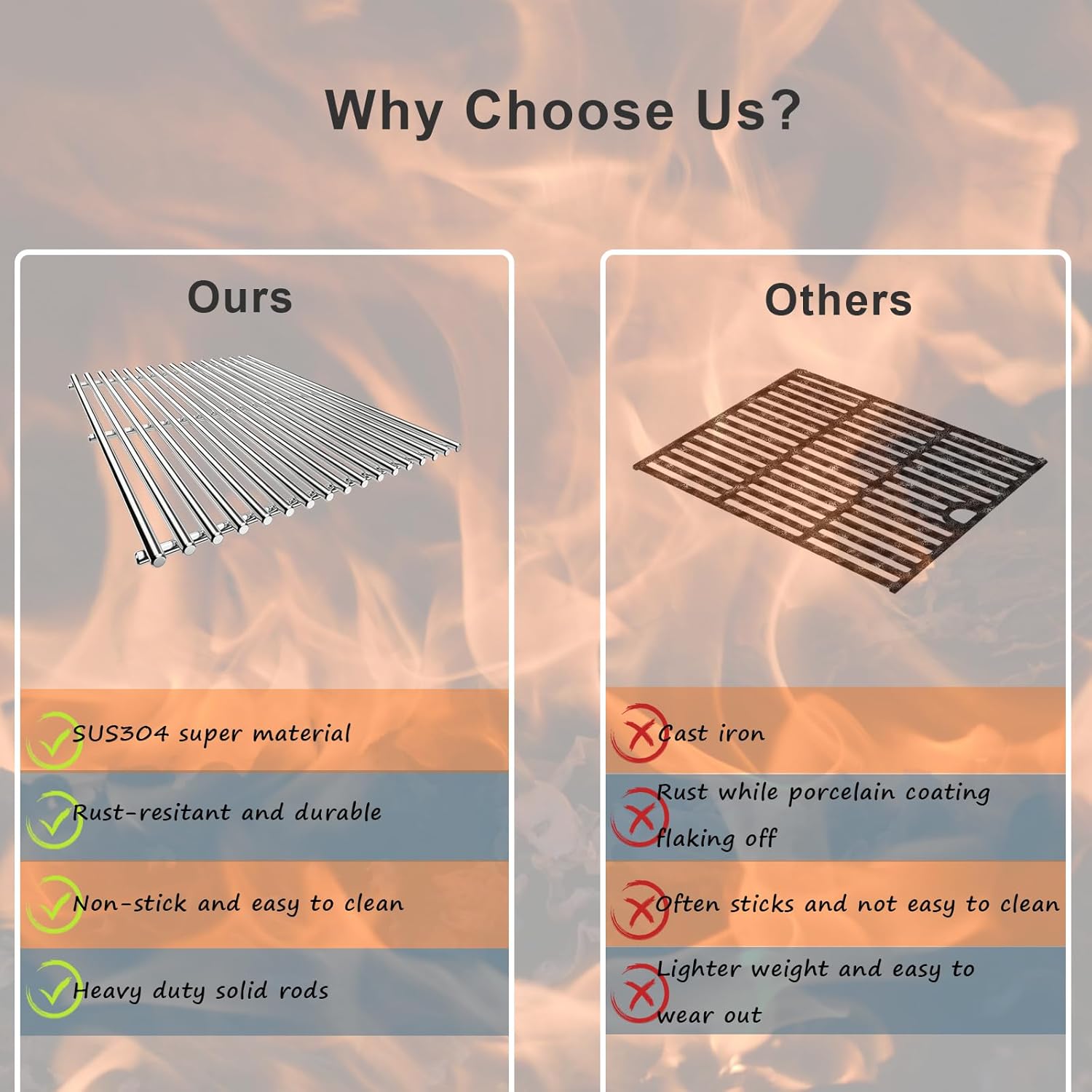 - 【Easy to Clean】- Grill grate with smooth surface is free of sharp edges and the end of the rods with a round design that don't hurt your hands. Unlike the cast iron grill that requires more effort to keep clean and tidy, this stainless steel grill grate is non-stick and can be easily cleaned just with a brush.