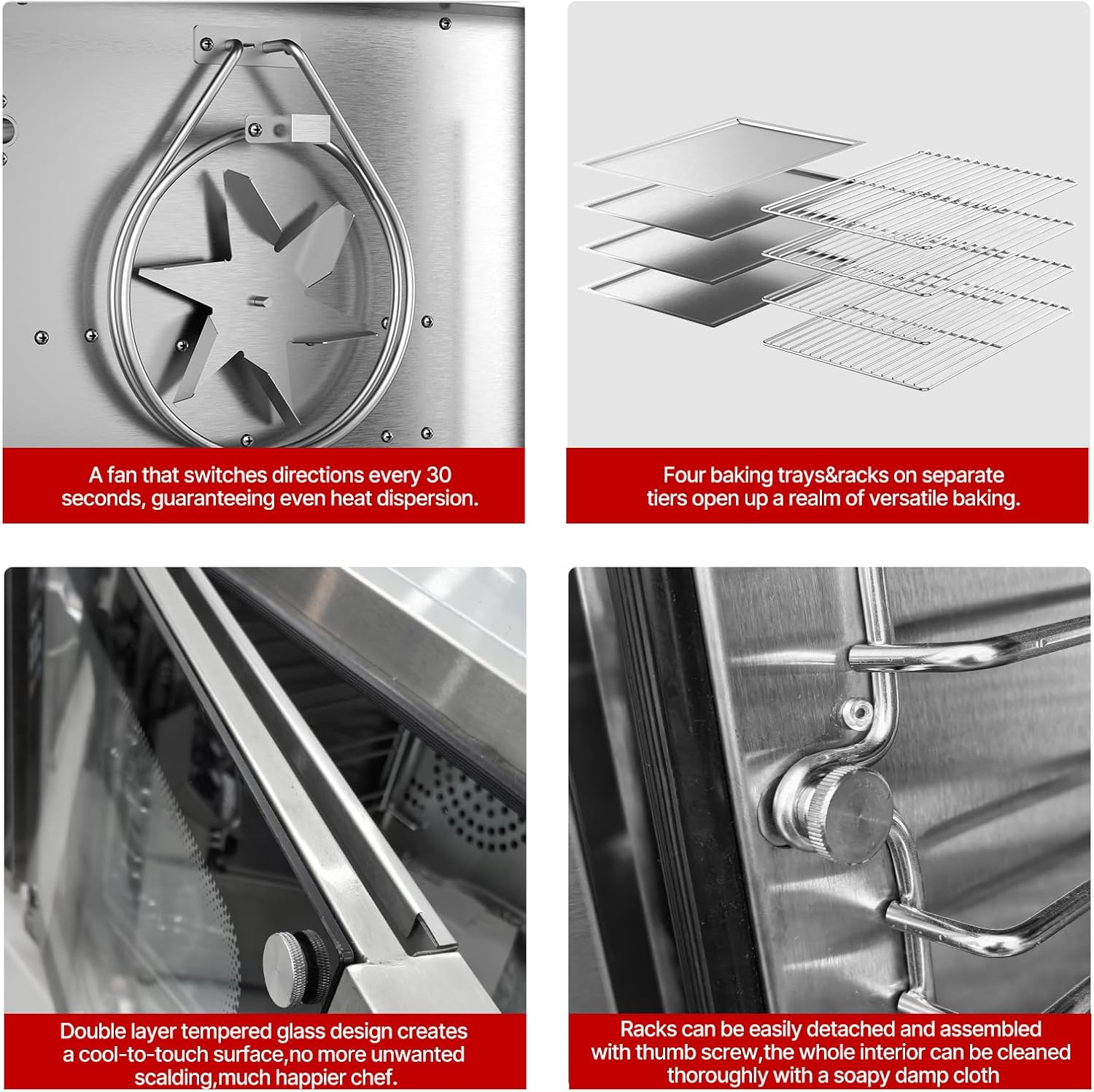 - Flexible 4-Layer Baking Arrangement:Four baking trays&racks on separate tiers open up a realm of versatile baking. the quantity and combination of the baking pans and racks can be adjusted with remarkable ease,let the versatility truly shine through.From buttery, flaky croissants to crispy, golden fries, succulent roasted chicken, and even delicate, creamy custards,you can have it all.
