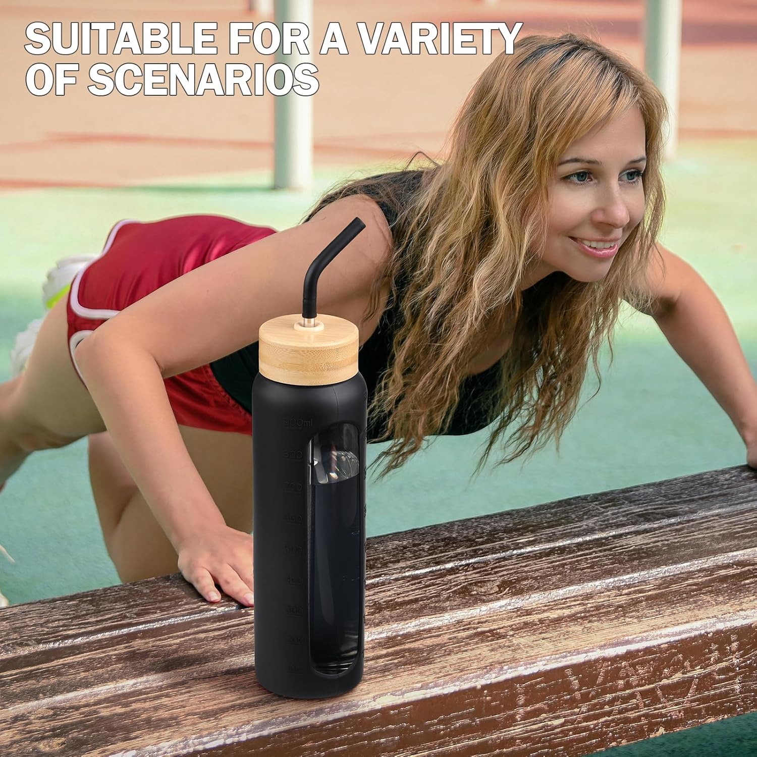 32oz Glass Water Bottle with Straw and 2 Lids- Bamboo Straw and Spout Lid with Phone Holder for Gym, Glass Drinking Bottles with Silicone Sleeve and Motivational Time Marker, Black