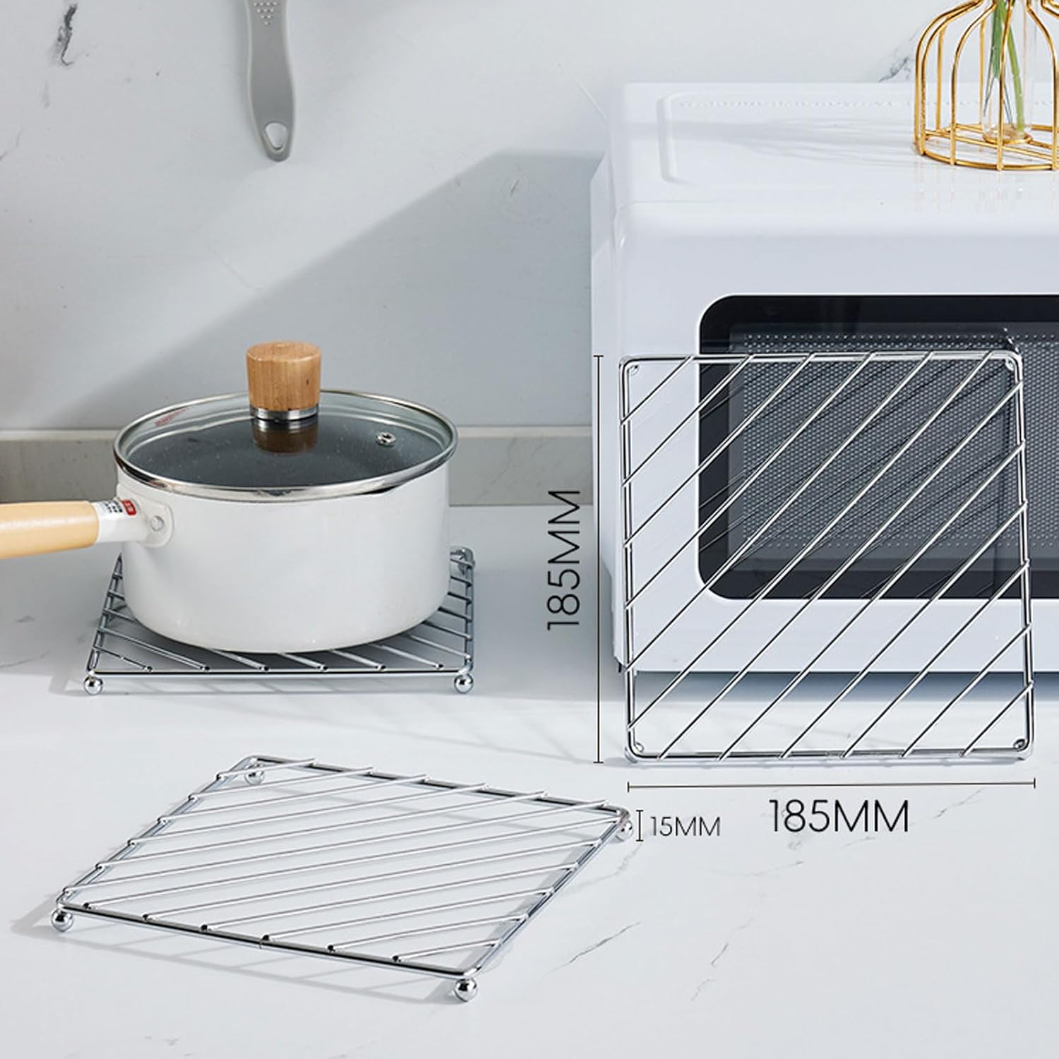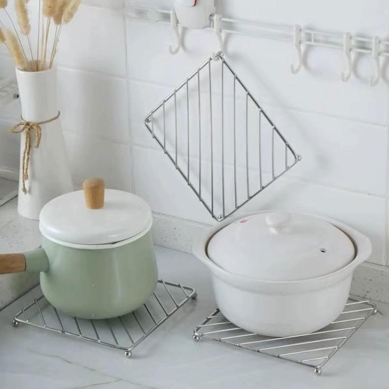 - STURDY AND TOUGH - Made of 304 stainless steel, this heavy-duty and well-made rack is rust-resistant and easy to clean. 、 Simply wash it with your hands or throw it into the dishwasher when it needs to be washed, hollow design for easy hanging. This metal trivet for pots and pans won't absorb odor, stain, and mildew. It's a practical item for daily use.