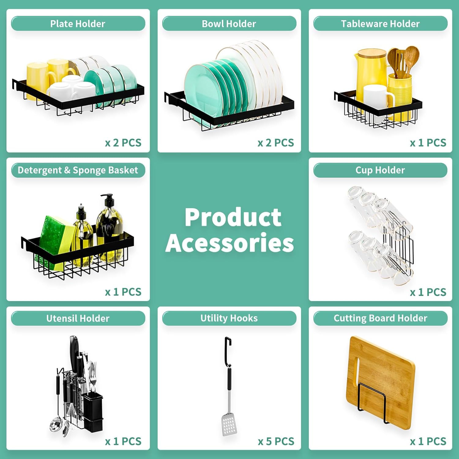 - 3 Tier Large Capacity Design:This over sink dish rack with an utensil holder, a cutting board holder, a Cup holder, a sponge holder and 5 utility hooks is convinient to place your plates, bowls, pots,chopping board, towel, sponge, dish cleanser, fruits, and vegetables etc. A real All In One over sink dish rack for saving place for your counter.especially for small kitchens and apartments.