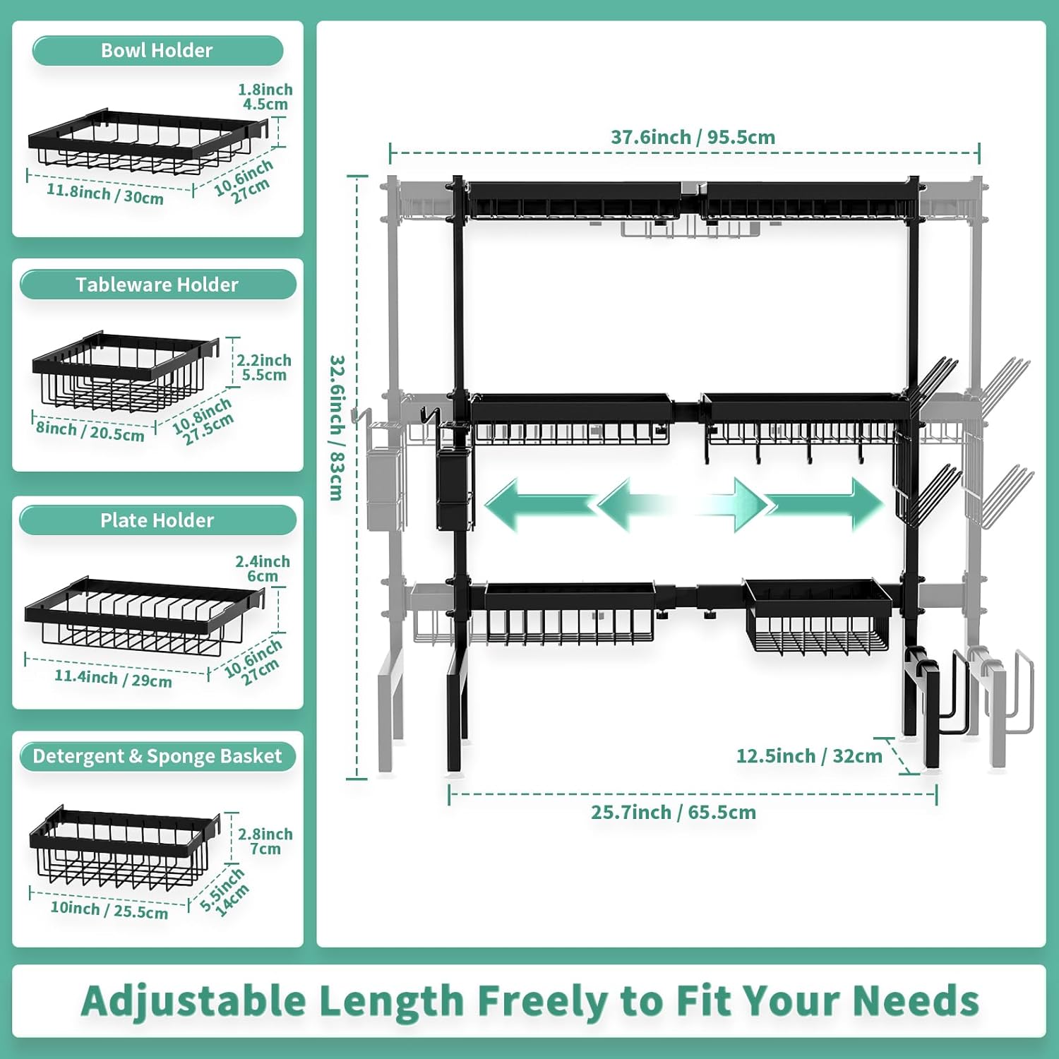 - Adjustable:This over the sink drying rack length can be adjusted from 25.7'' to 37.6'' according to your needs.It's dimension as follow:L*W*H: 25.7~37.6x 12.5 x 32.6 inch.(not count the height of the dish and bowl).