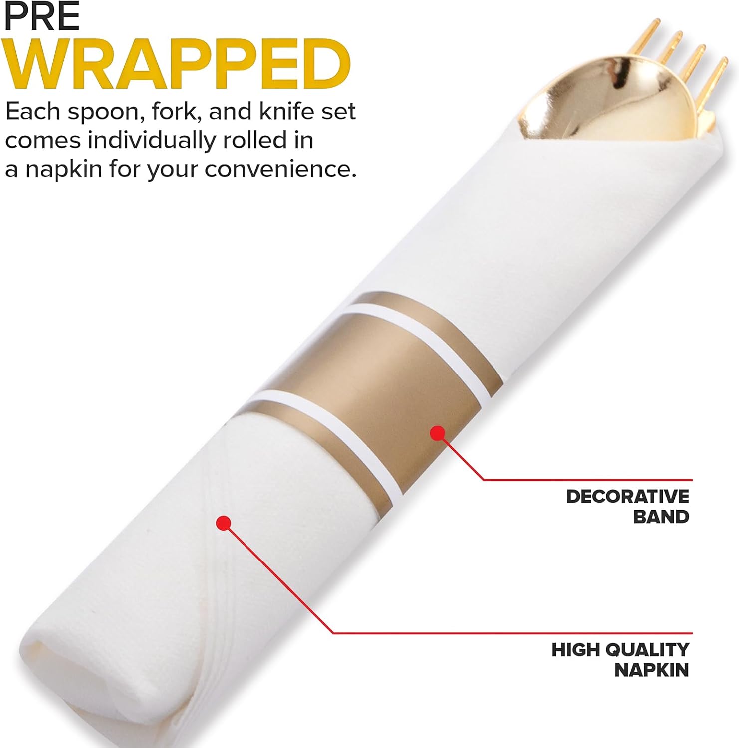 - Pre-rolled Convenience: As the perfect pre wrapped silverware set disposable, you don't even have to worry about buying napkins. Our pre rolled silverware disposable, paired with these pre-rolled napkins, makes your event a breeze.