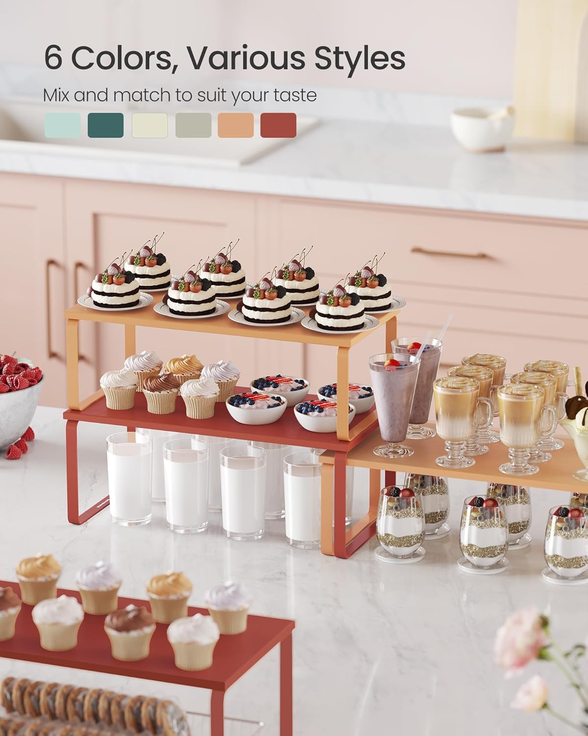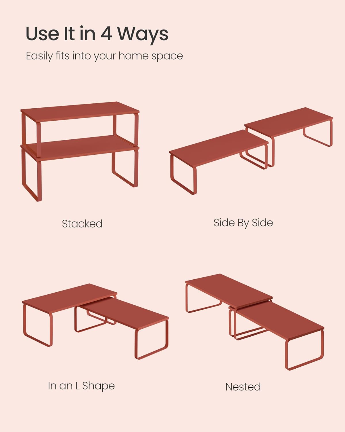 SONGMICS Cabinet Organizer Shelf, Set of 2 Kitchen Counter Shelves, Kitchen Storage, Spice Rack, Stackable, Expandable, Metal and Engineered Wood, Mandarin Red UKCS200Y02
