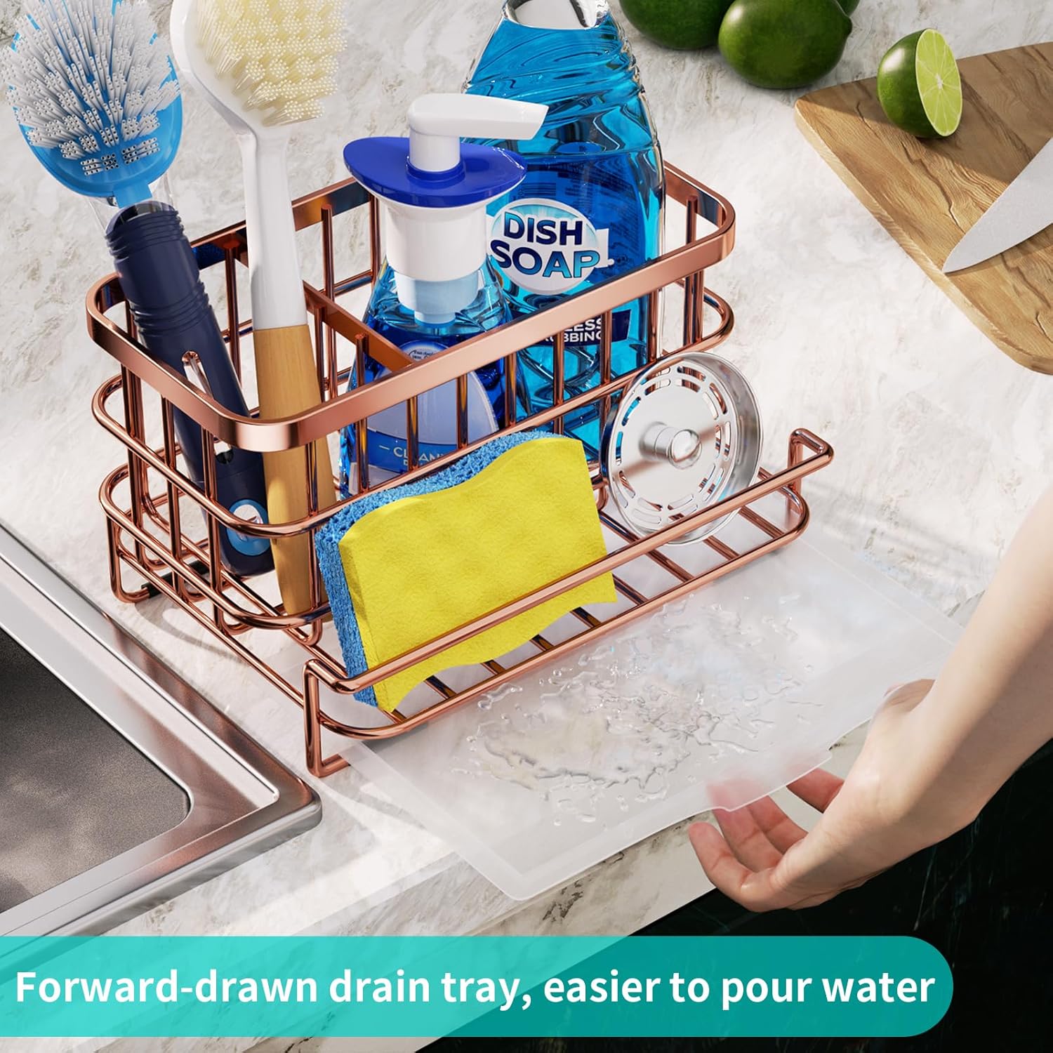 - [Pull-out Drain Tray]: Our sink caddy comes with a pull-out drain tray to help you catch all the water dripping from your kitchen items and prevent stains on the countertop. You can easily pull out the drain tray of sink organizer caddy for cleaning