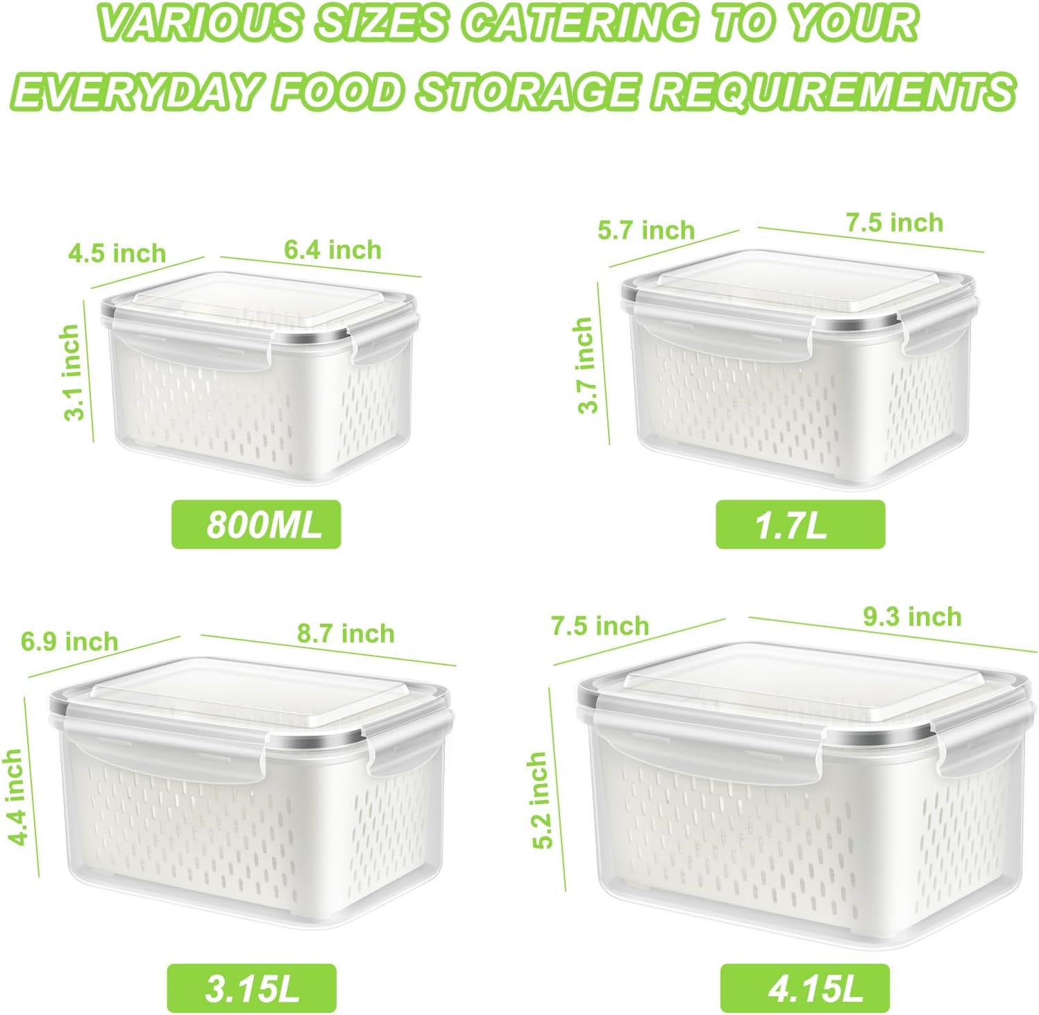- 4 PACK PRODUCE CONTAINERS: TBMAXS fruit storage containers come with 4 sizes of 17.5 cup + 13.3 cup + 7.2 cup + 3.4 cup for fridge or pantry storage and organization. Airtight food containers is perfect to store fresh produce, fruit, lettuce, cabbage, berry, pre-cut food, salad mix, meat, seafood or dry food