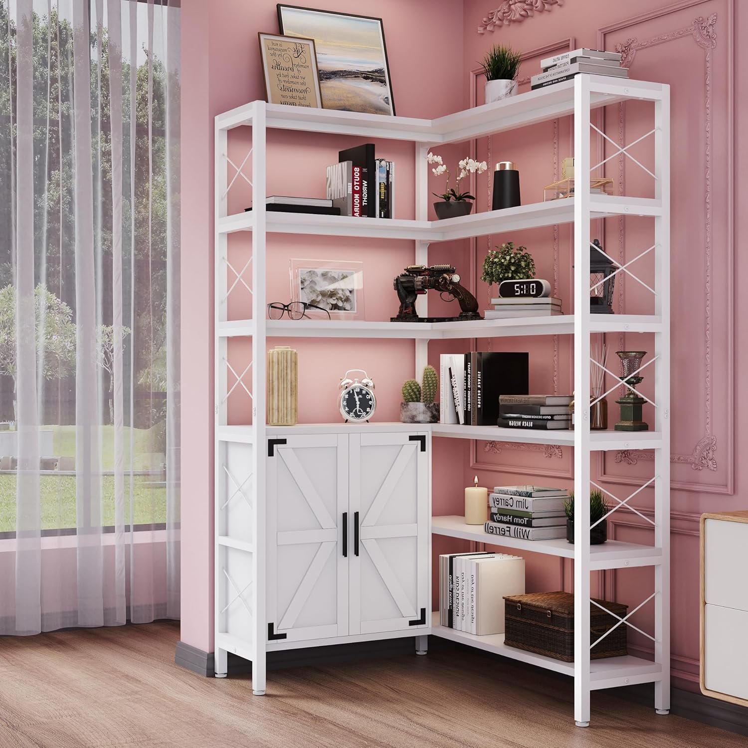 6-Shelf Corner Bookshelf, Vintage Industrial Corner Shelf Etagere Bookcase, Large Book Shelf with Metal Frame Open Storage Corner Cabinet (White-Lockers, Small)