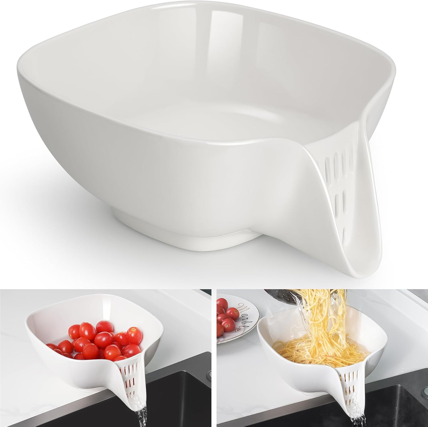 - Larger Size Design: Measuring 9.4x7.8 inches, this ceramic colander bowl is larger than typical bottom-drain products. It can be easily placed on the edge of the sink, making it ideal for rinsing and draining vegetables, fruits, pasta, and other foods, meeting a wide range of family needs.