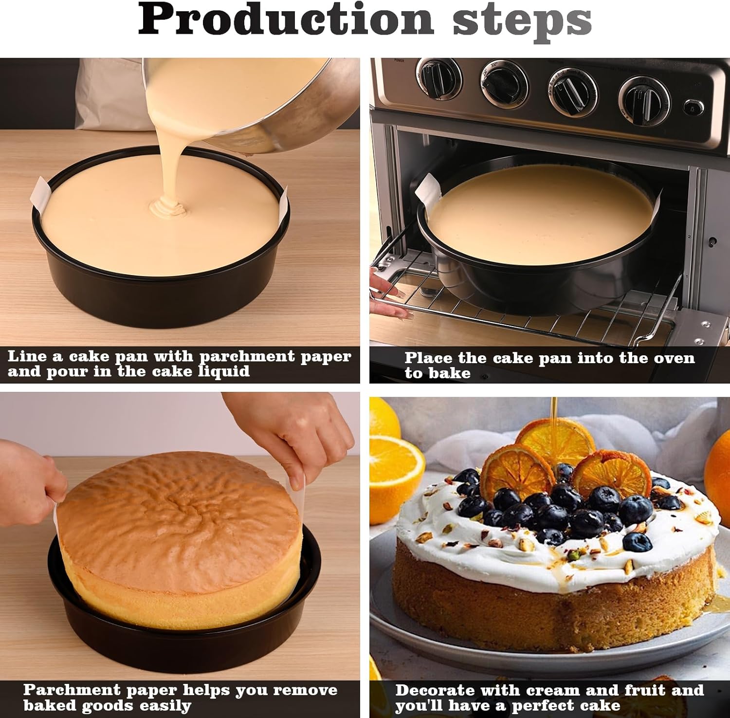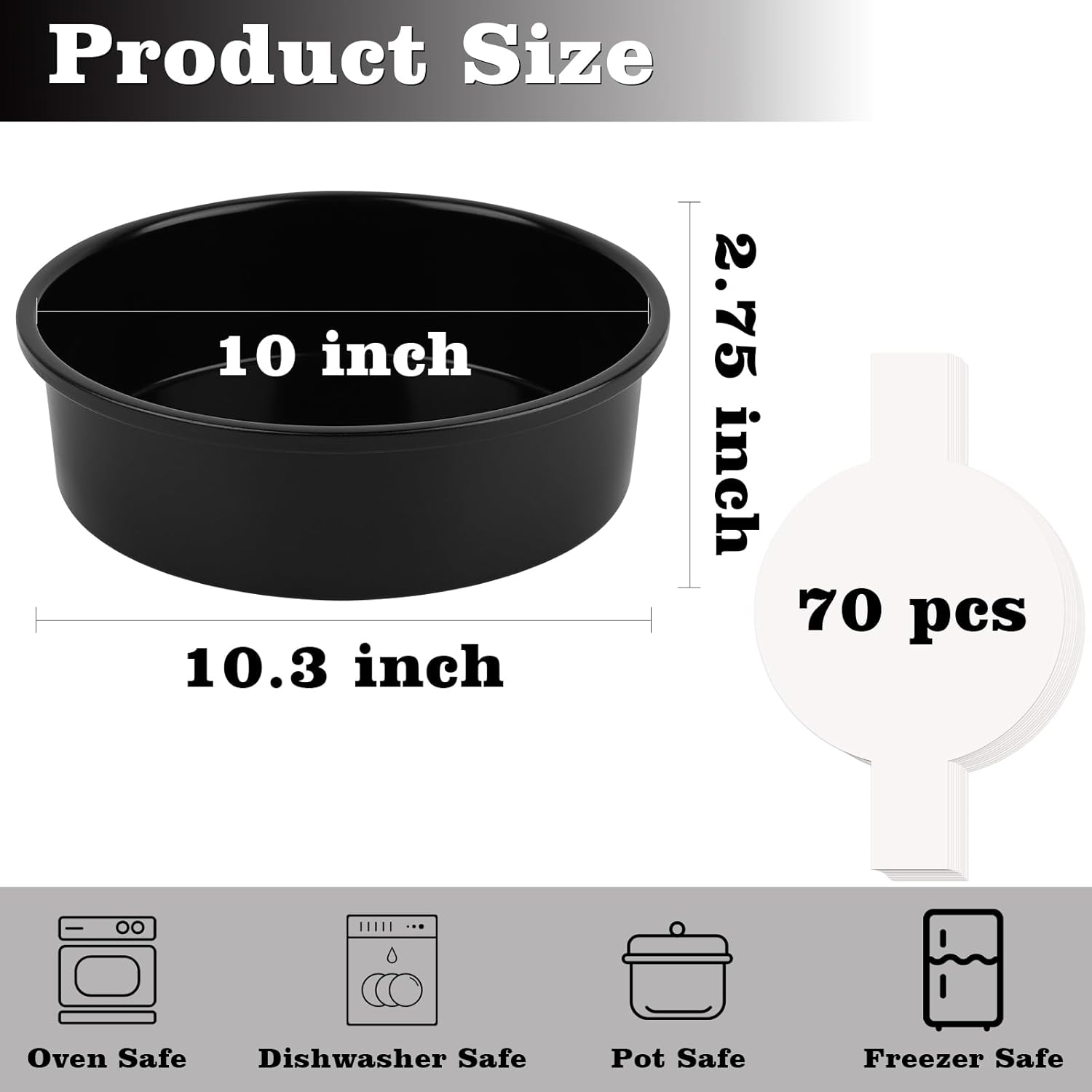- Round Cake Pan Set: 2 pack round baking pan, size: 10 x 2.7 Inch.Integrated molding process to prevent leakage. The 100 count of parchment paper that come with it make the demoulding job much easier and are perfect for baking enthusiasts and beginners.