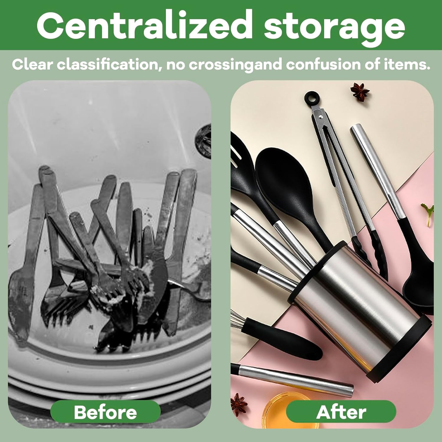 - 【Stainless Steel Material 】The utensil holder is made of high-quality 304 stainless steel, ensuring durability. This material guarantees that the holder will not rust or corrode, making it a long-lasting and elegant addition to the kitchen.