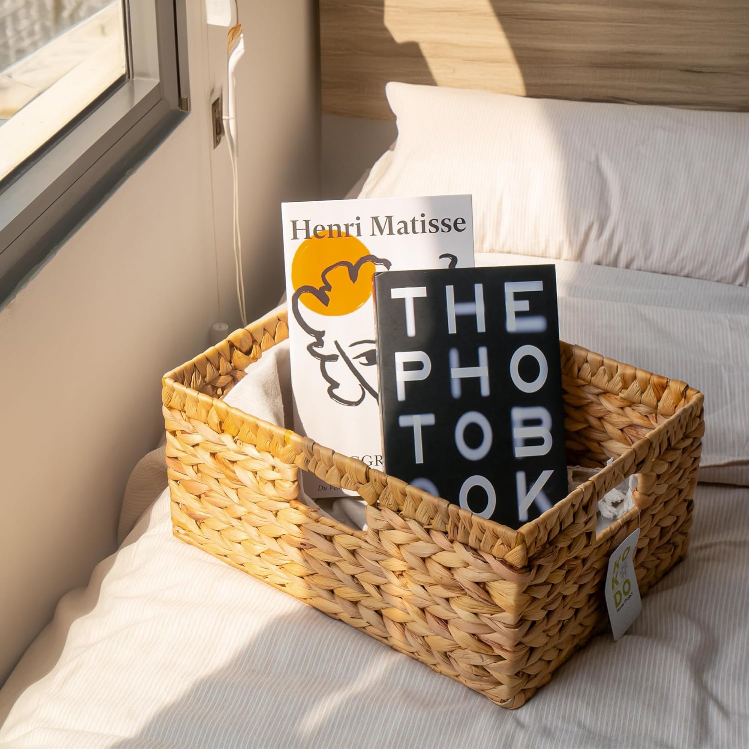 - 🌿[Sturdy Design] Meticulously handwoven water hyacinth over an iron frame ensures durability and stability for long-term while selected matual water hyacinth material provide a unique and natural look. This rectangular wicker basket ensures long-lasting use.