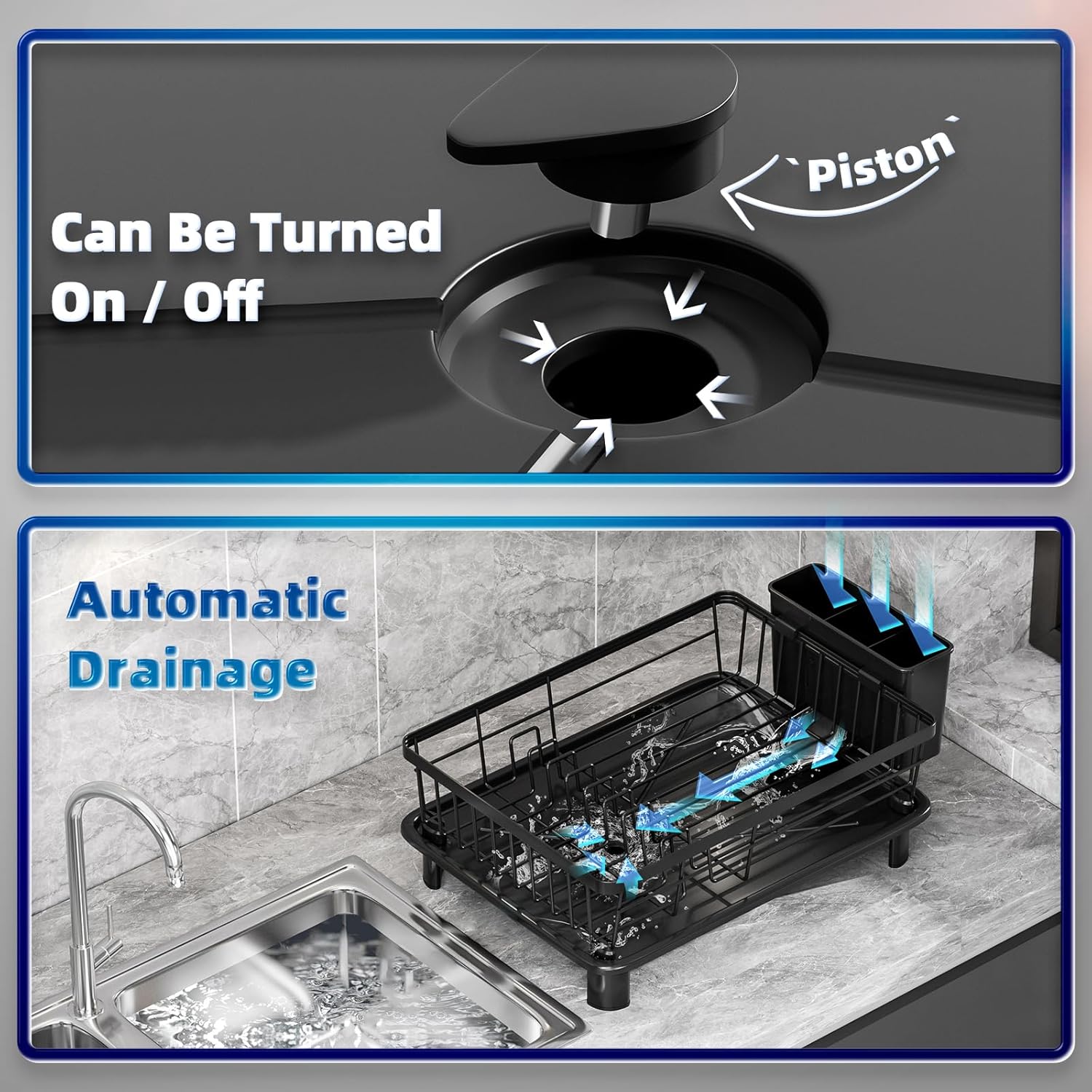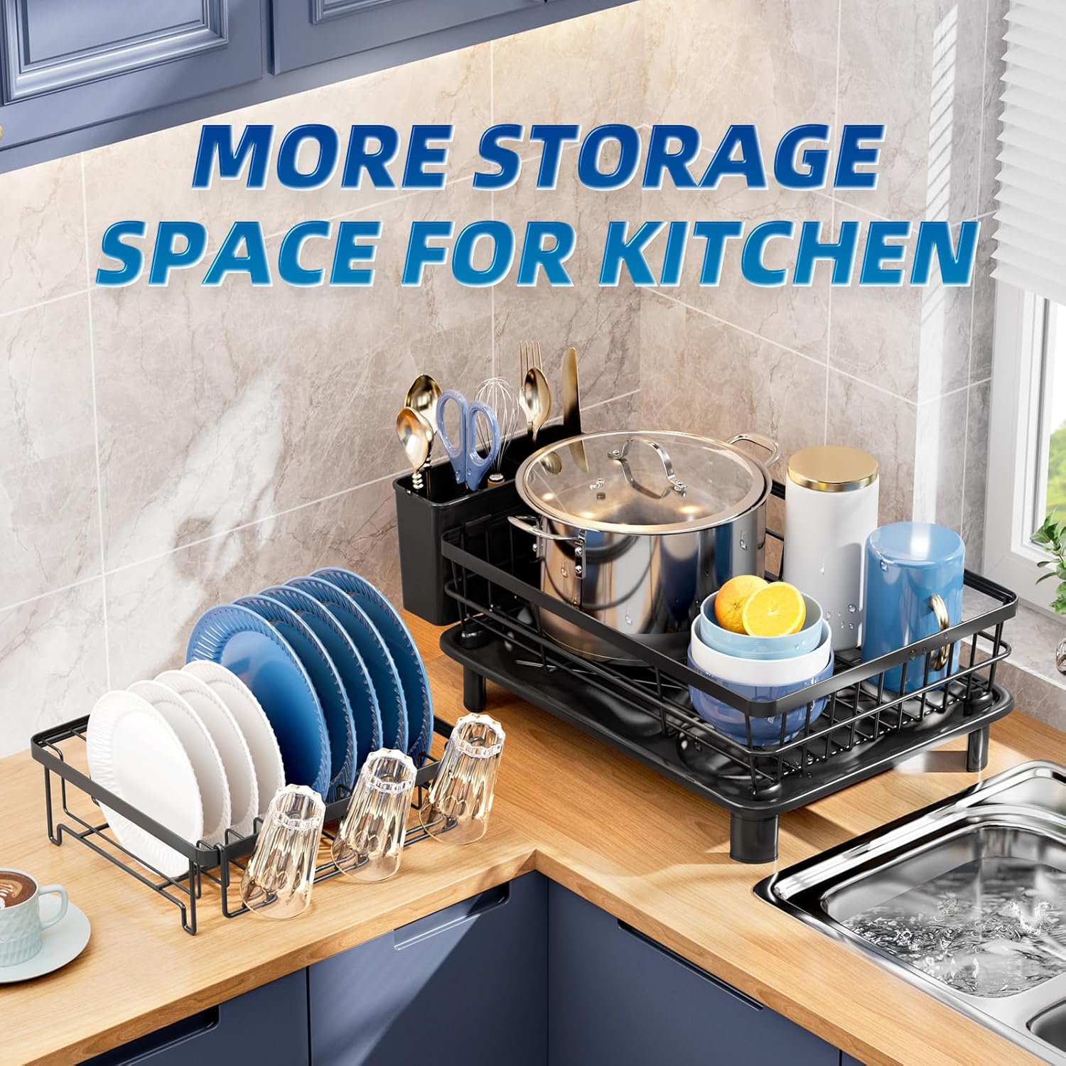 2 Tiers Dish Drying Rack, Space-Saving Dish Racks for Kitchen Counter, Dish Drainer Drying Rack with Drainboard, Utensil Holder Cups Holder Plate Rack and Automatic Drainage Drainboard, Black