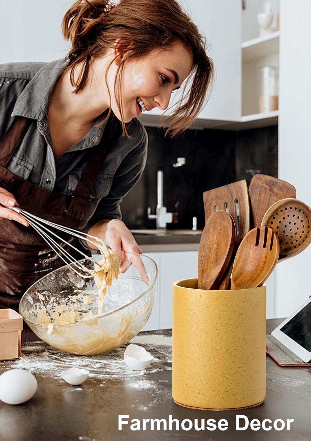 - -STABLE & LASTING: Made of premium ceramics, this ceramic utensil holder is obviously heavier and steadily stands on your countertop. Farmhouse style design with playful and long lasting kitchen decorations, withstands long-time daily uses.