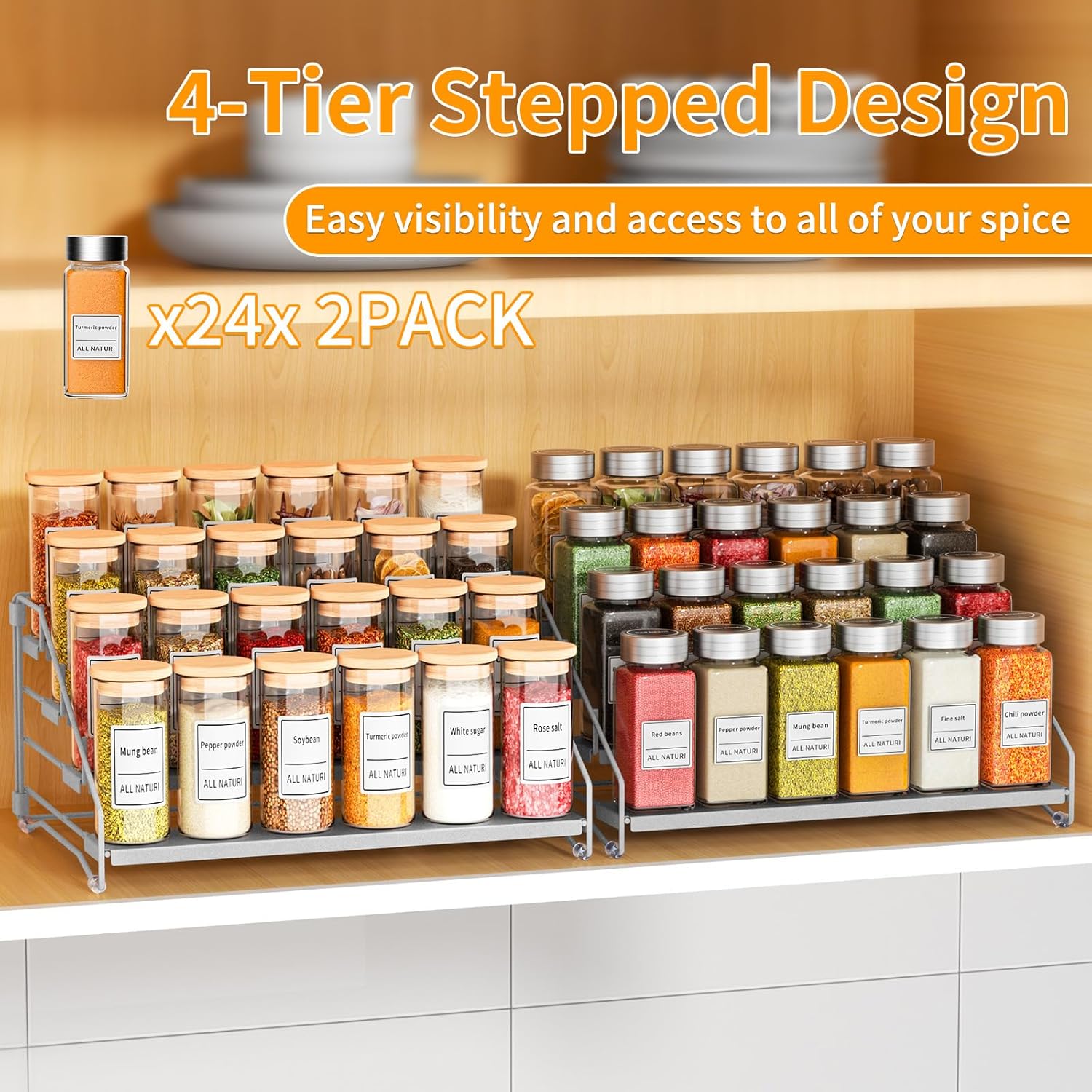 - 【2 PACK 4 Tier Spice Rack Maximize Cabinet Space】:RCHYFEED spice rack organizer with 4 tier stepped design, provides easy visibility and access to all of your spices.It maximize your kitchen's vertical storage space,holds 48 spice jars.The spice organizer is: 13"x10"x6.5",fits perfectly on your kitchen countertop or inside a cabinet.