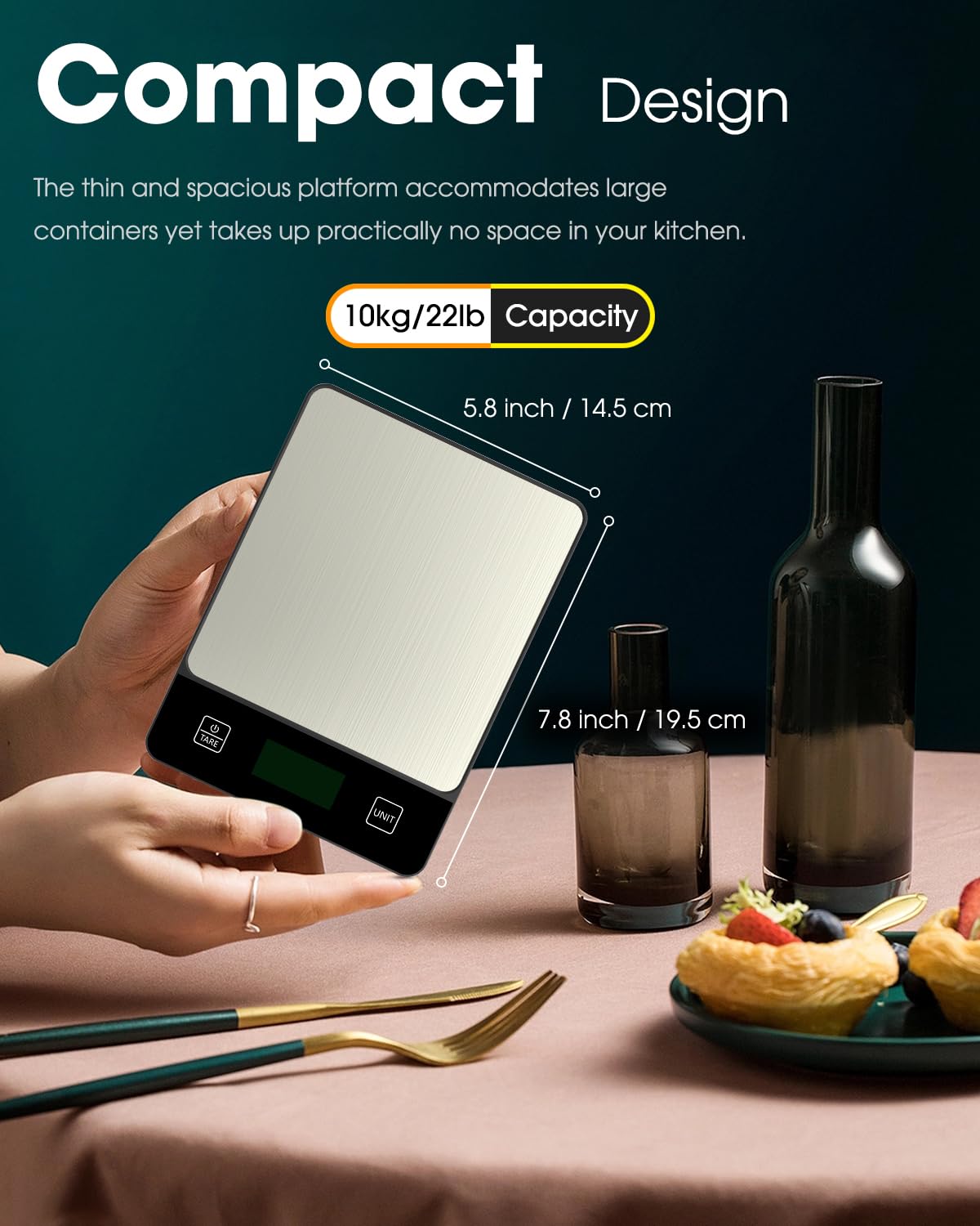 - Slim Design -- The food scale made of Stainless Steel Material, dimensions 7.8*5.8*0.6 inch; It is easy to use and clean. The digital food scale’s convenient size makes it easy to store in your kitchen.