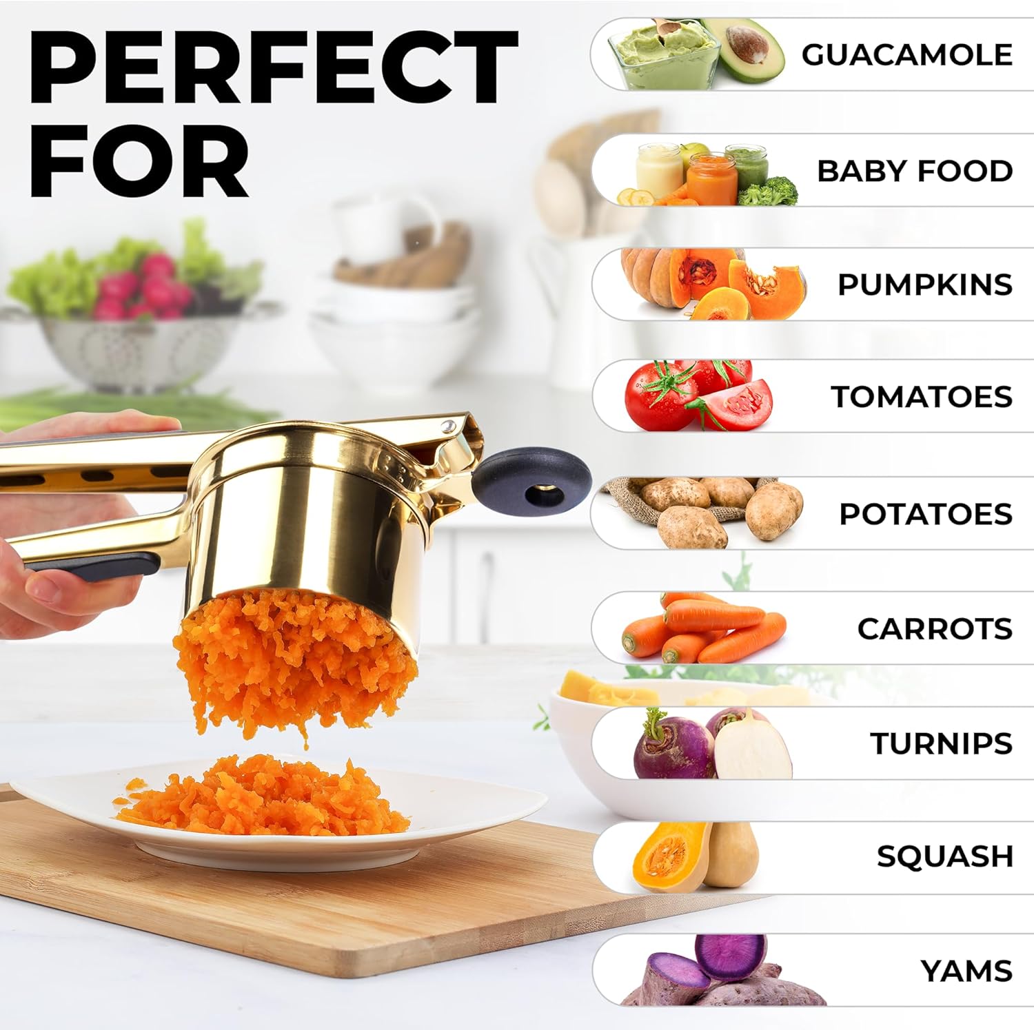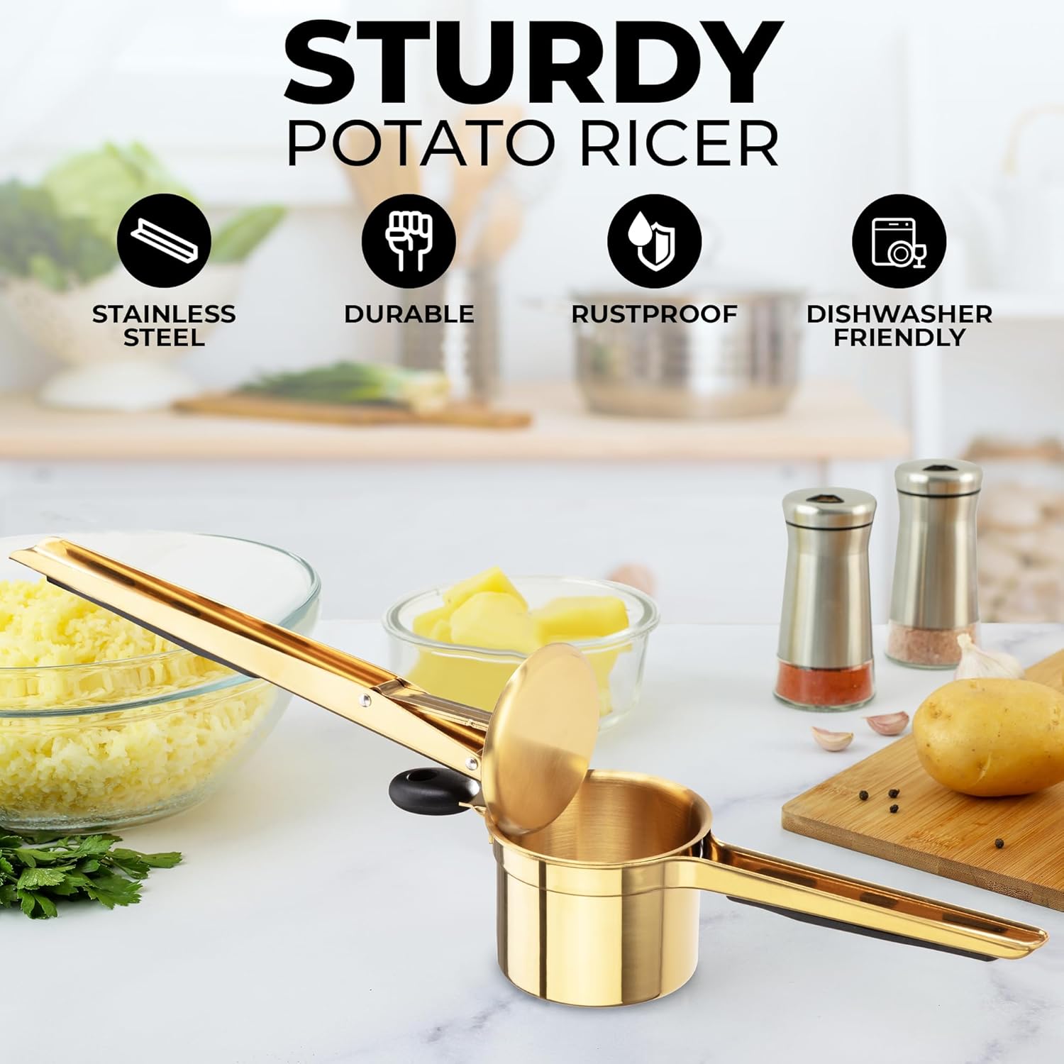 - SPUD-TACULAR KITCHEN TOOL: Making light and fluffy mashed potatoes has never been easier. With its strong and durable stainless steel material, this potato ricer is rust, corrosion, and stain resistant and durable enough to last you a lifetime.