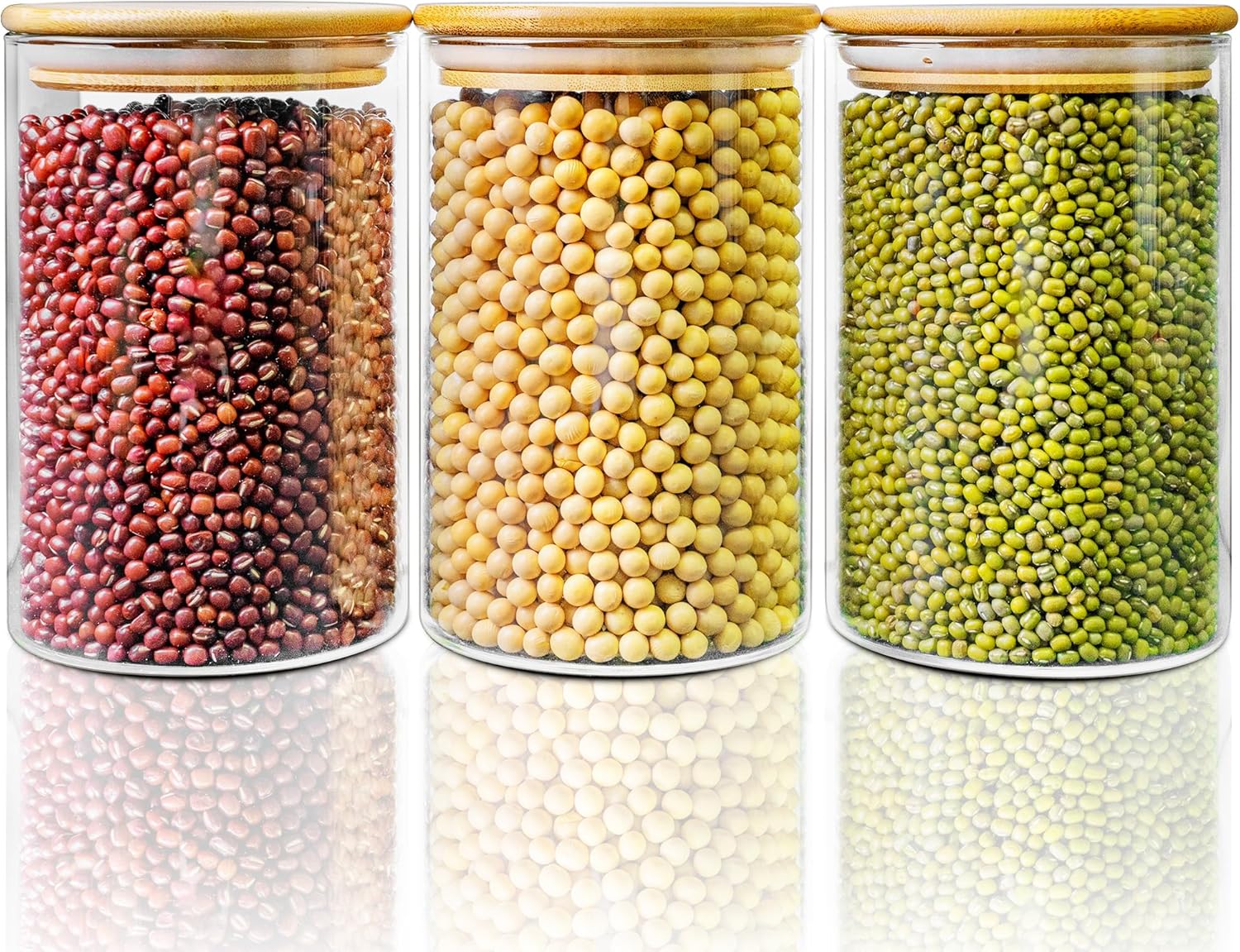 45oz - 3 Pack Glass Jars with Bamboo Lids, Glass Pantry Storage Containers with Airtight Lids, Round Air Tigh Food Storage Canisters for Cereal, Pasta, Flour, Sugar, Rice, Best for Kitchen Organizer