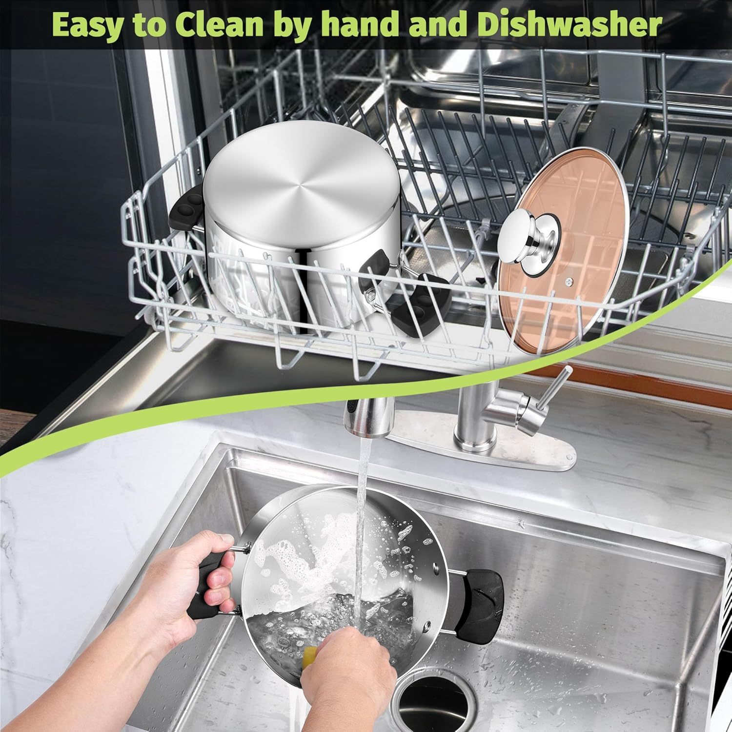 - 【Easy To Clean】Both brushed surface interior and mirror finished surface exterior can reduce the risk of food sticking and provide a smooth touching, 3-ply Bases get rids of burning of the food, The pot and lid have smooth edges with no sharp place and no dead corner, Will not hurt your hands and not hide dirt when using and cleaning, Easy to clean by hand, And dishwasher safe to keep away from the hassle of doing dishes, Free your hands and saving your labor and time when you are busy