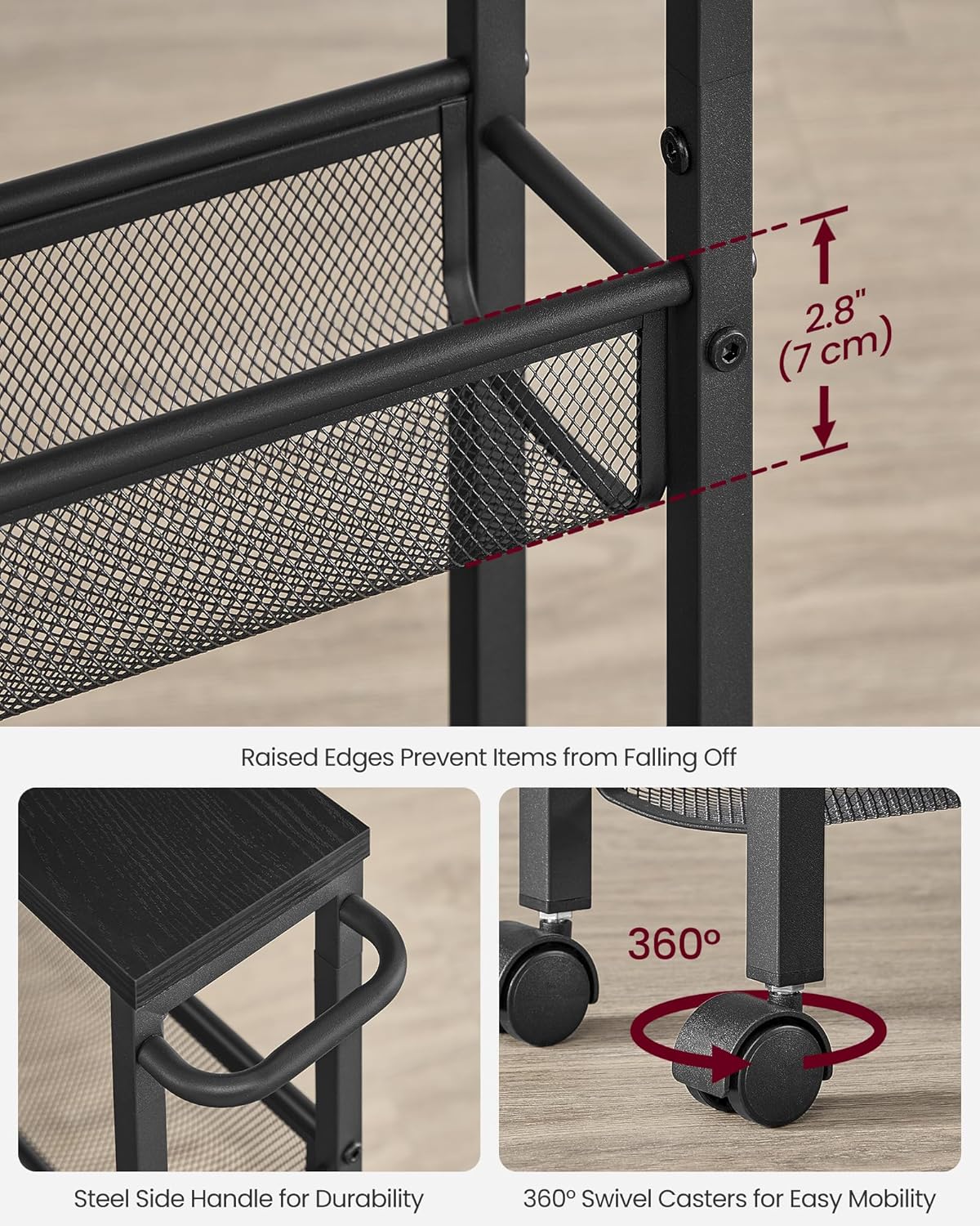 VASAGLE Slim Rolling Cart, 4-Tier Storage Cart, Narrow Cart with Handle, 5.1 Inches Deep, Metal Frame, for Kitchen, Dining Room, Living Room, Home Office, Ebony Black and Classic Black ULRC032B04