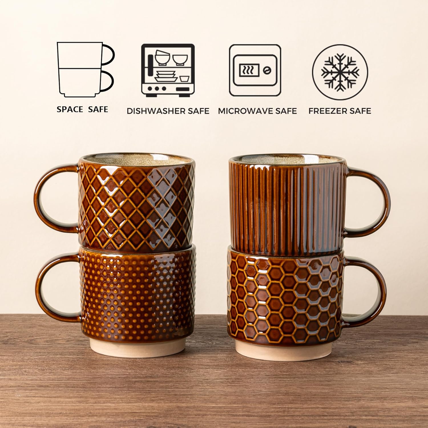 - Stackable and Modern Design: These ceramic mugs feature a beautiful embossed texture design, the smooth rim ensures a comfortable drinking experience, the stackable design allows for easy storage and helps save space in your kitchen.