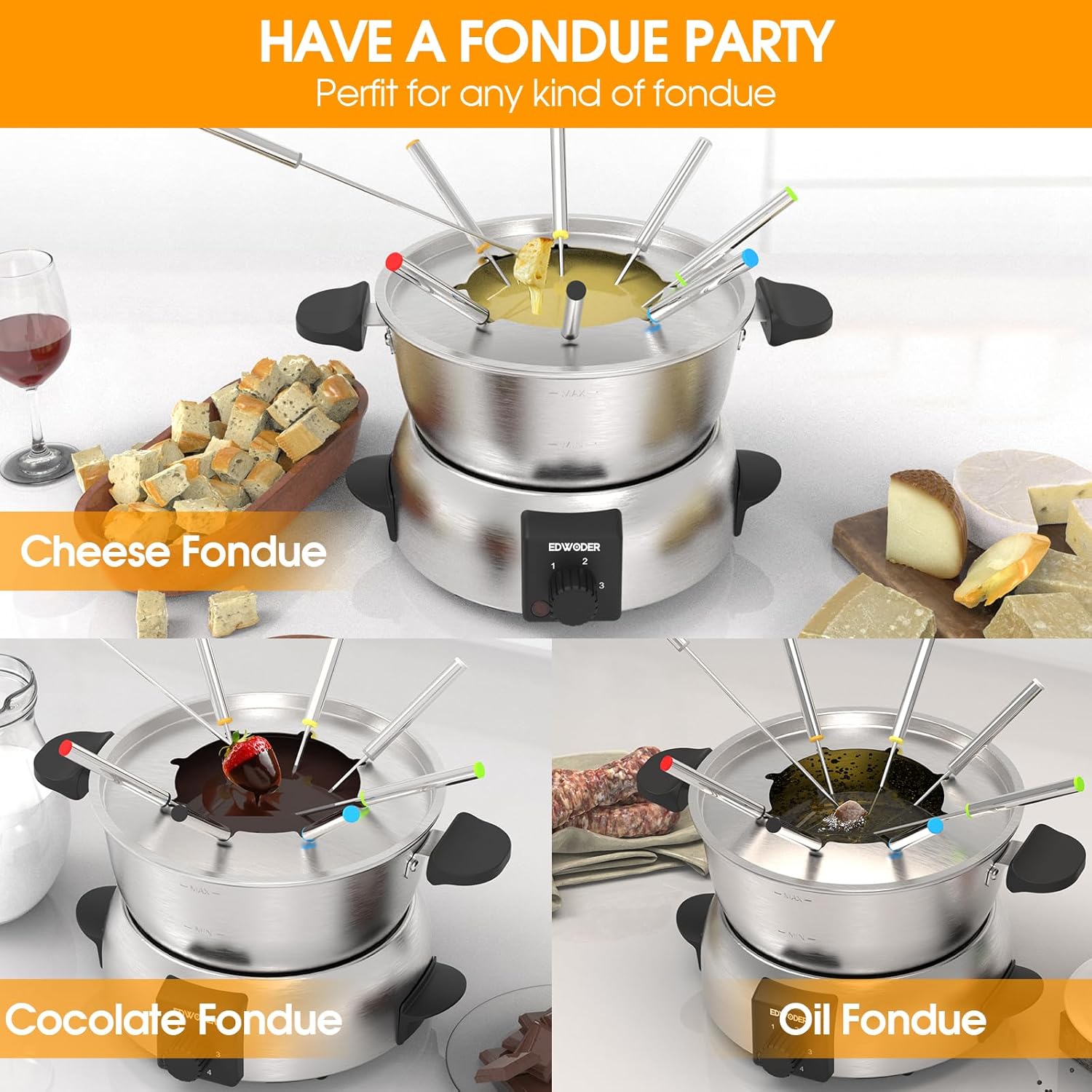 - ALL TYPES OF FONDUE - The temperature of electric fondue maker can be controlled easily with knob, so it can be used for different types of fondue: classic burgundy fondue, cheese fondue, chocolate fondue,oil fondue.Great for dipping fruit,bread,vegetables,meat,marshmallows and more food.