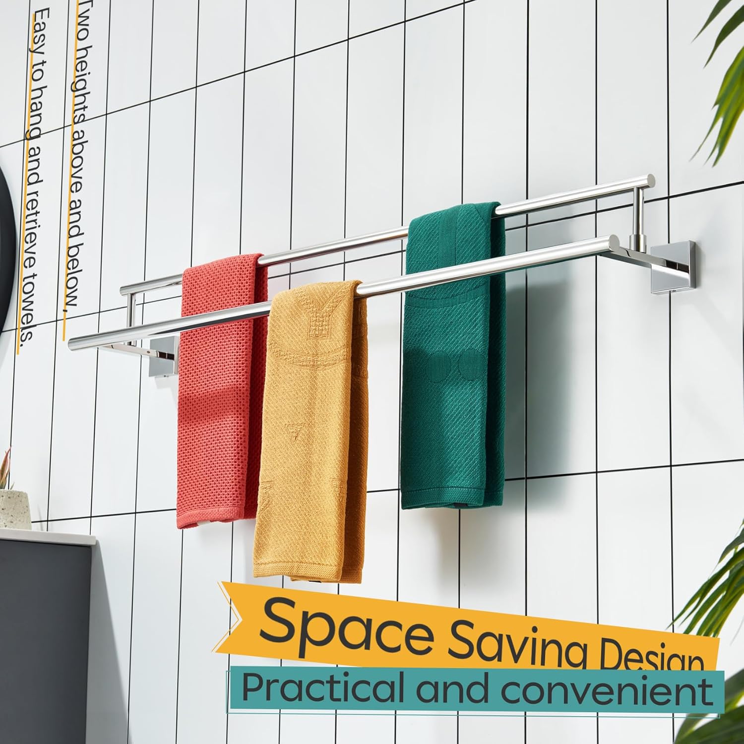- ◄ MODERN DESIGN ► KOKOSIRI double towel rack with two rails combines elegant square, sleek round, and unique rectangle elements to bring a modern aesthetic to your bathroom, shower room, toilet, kitchen, washroom, pool or garage. You can choose from our series of bathroom hardware for a complete, coordinated look to your place