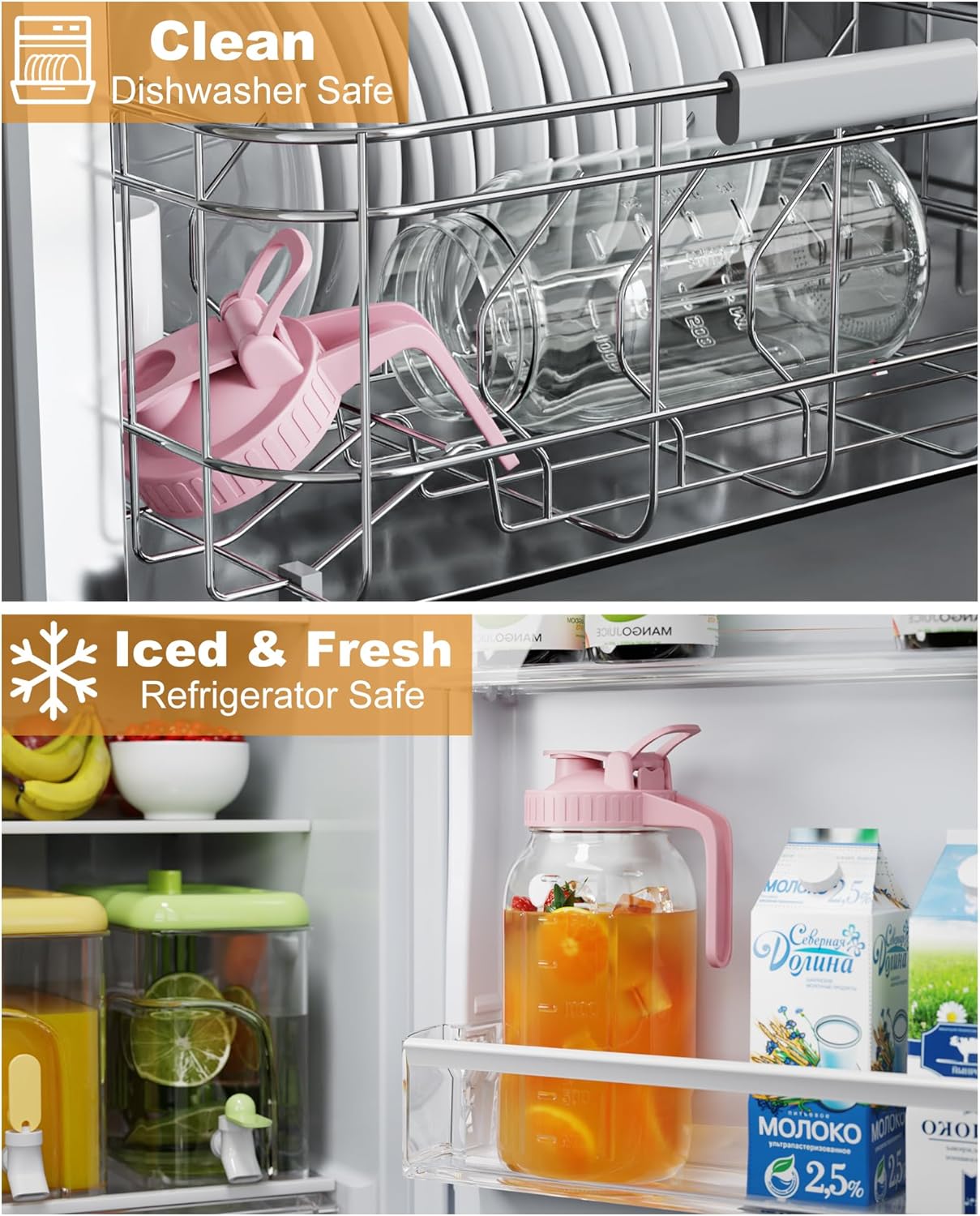 - Keep Your Drinks Fresh and Flavorful -64oz glass pitcher comes with an airtight flip with silicone seal that seals in the flavor and freshness of your favorite beverages while also being leak-proof. It's easy and convenient to open, pour and close, making it perfect for store your drinking