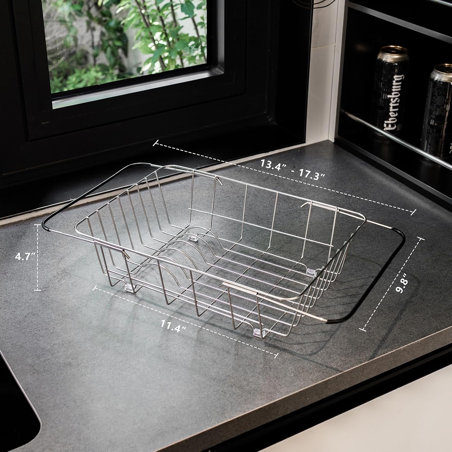 - 【Adjustable and Space Saving】: The supporting bars of the over sink dish drying rack can be extended from 13.8" to 18.31", saving your counter space while fitting most sinks.