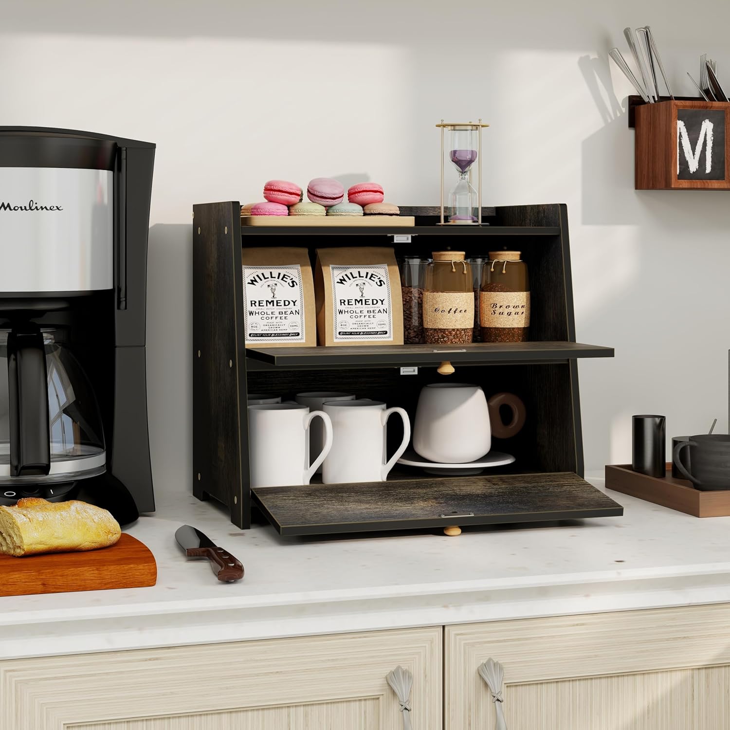 Vintage Double Layer Bread Box for Kitchen Counter Bamboo Bread Storage Container Large Capacity Bread Storage Bin (Antique Black)