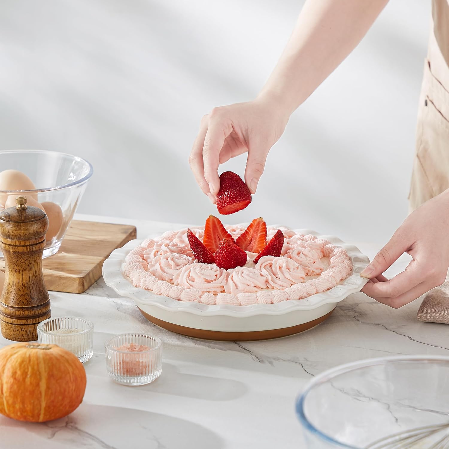 - 【Premium Nonstick Glaze】Featuring a lead and cadmium-free glaze, this pie plate offers superior nonstick performance, ensuring your baked goods come out effortlessly every time. Scratch-resistant and easy to clean, it's safe for dishwasher, refrigerator, and oven use.