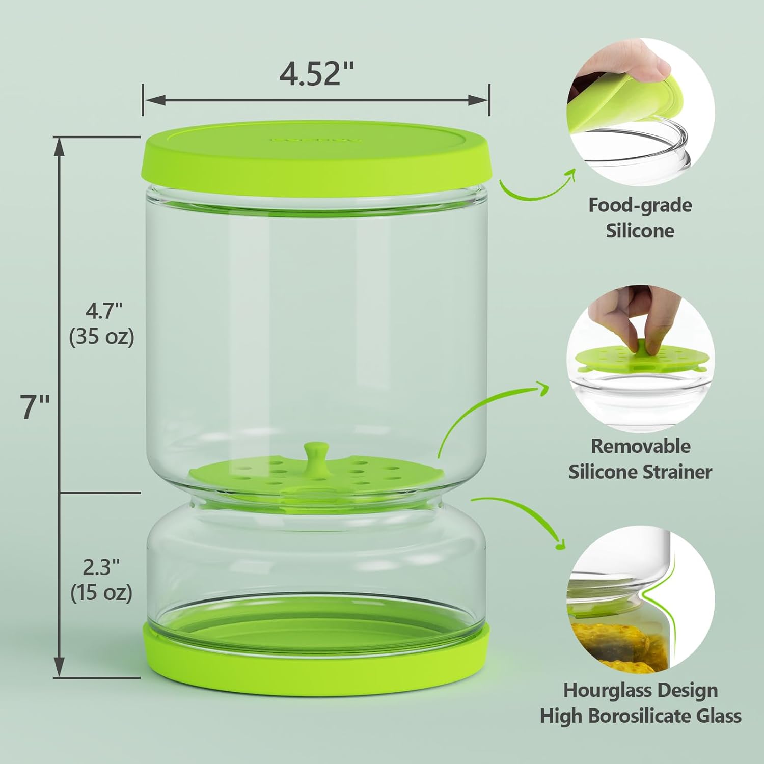 - Convenient Pickle Strainer: A glass pickle jar with strainer makes it easy to remove pickles or other items from the jar without having to fish them out with a fork or other utensil; no worries about getting your fingers, table, sandwich wet any more