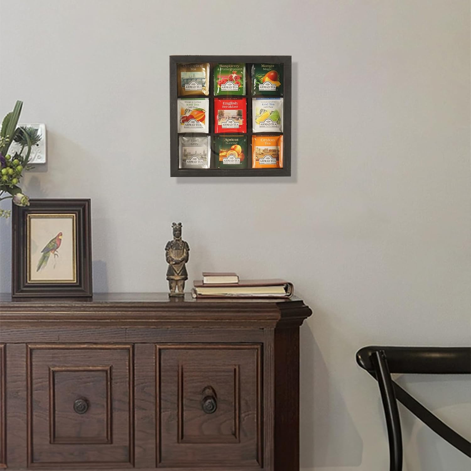 - Multi-Purpose Design: The dividers can be removed to turn it into a shadow box. The back panel has two holes and includes nails for easy hanging on the wall. In addition to tea bags, This tea box can display anything you want, such as teacups, crafts, dried flowers, photos,etc.