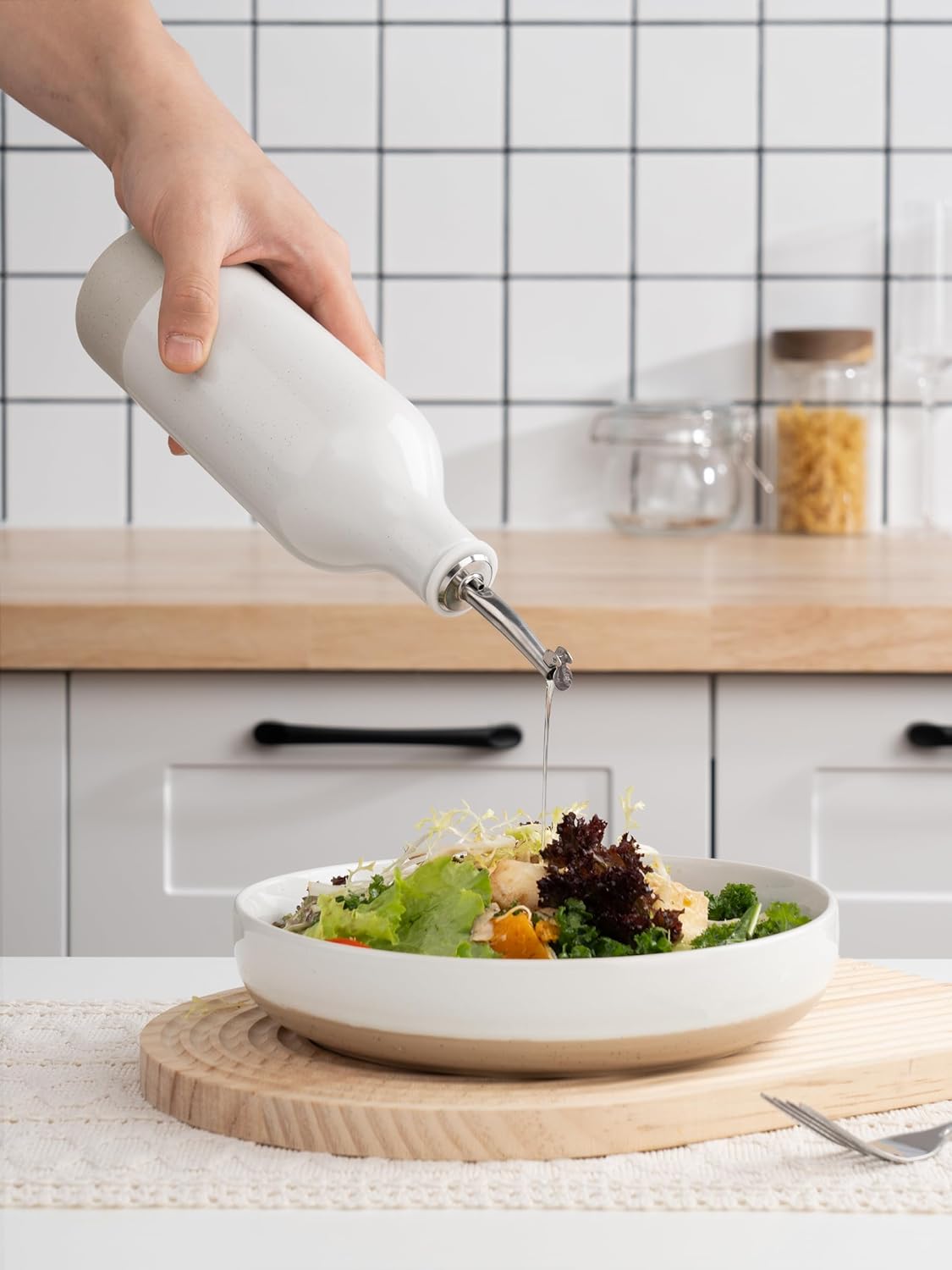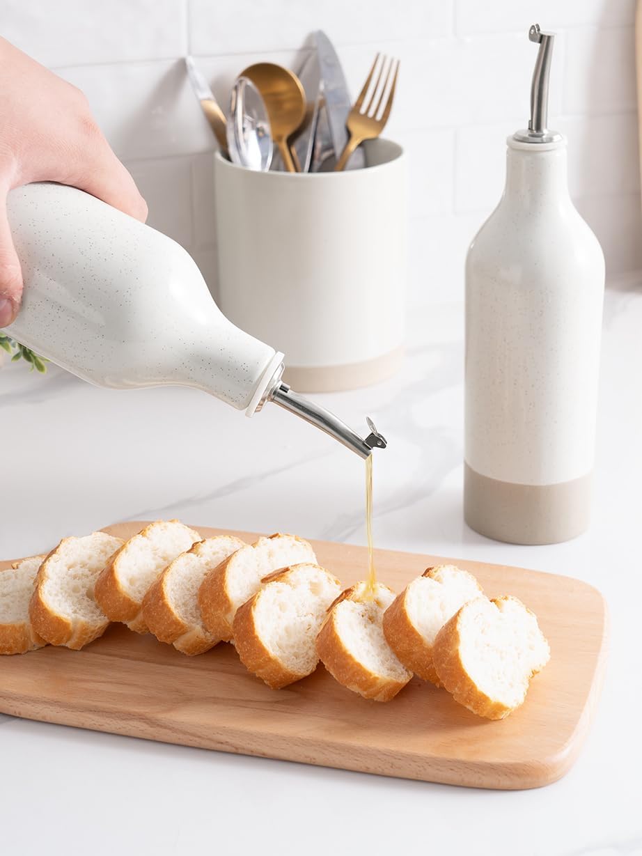 - ELEGANT OLIVE OIL DISPENSER BOTTLE - Our ceramic oil dispenser is handmade and batch fired at extremely high temperatures, forming a smooth glaze and providing a resilient surface for strength and durability, easy to clean and dishwasher safe for long-term use