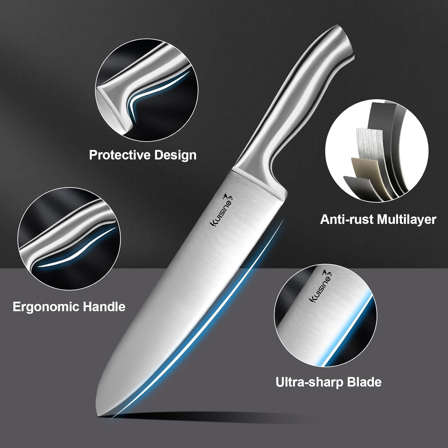 - High Value Knife Block Set: This Kuisine chef knife set includes premium 8" chef knife, 8"Slicing Knife, 7" santoku knife, 8" serrated bread knife, 5"utility knife, 3.5"paring knife, 6pcs 5"steak knife,1pair kitchen shear and a wooden block with built-in sharpener.